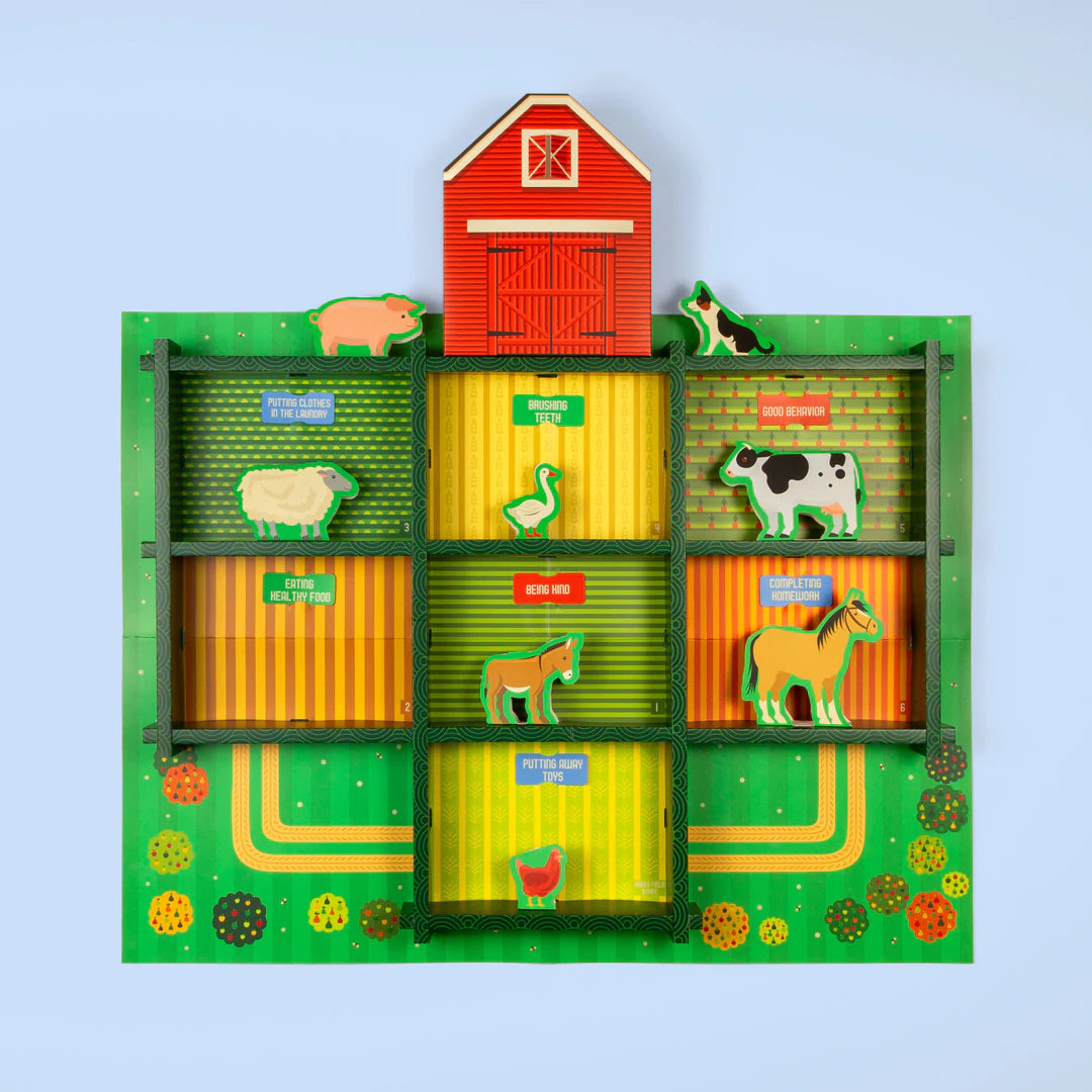 Have fun on the farm with this four in one activity kit! Use it as a beautiful piece of wall art, an educational reward chart, a fun farmyard activity playset, or use the dice provided to play fun and educational farmyard games. Take a trip to Piggott’s farm with a beautifully illustrated farmyard scene that will brighten up any room.