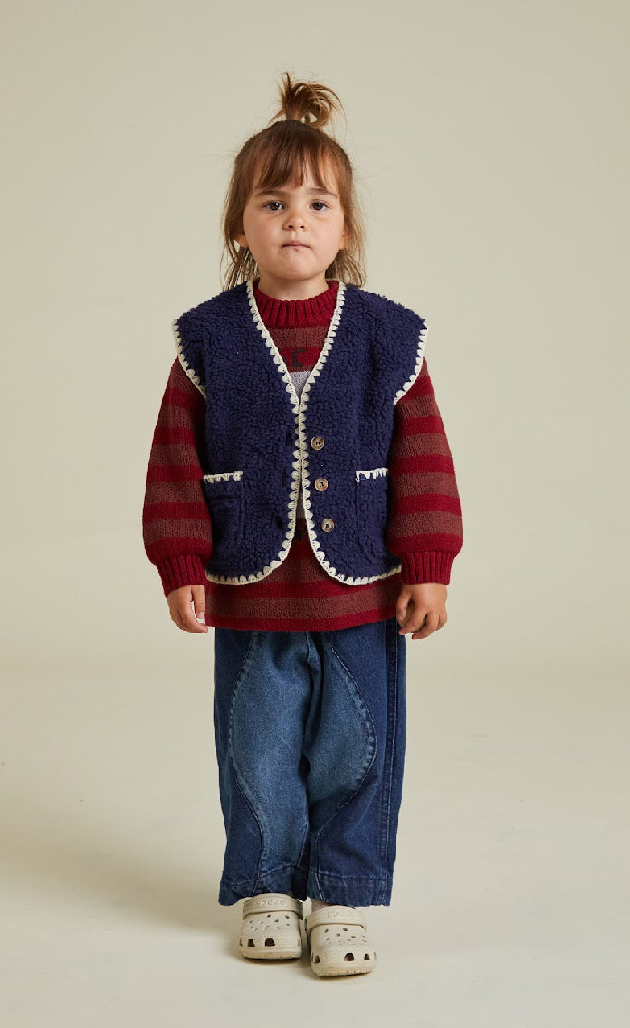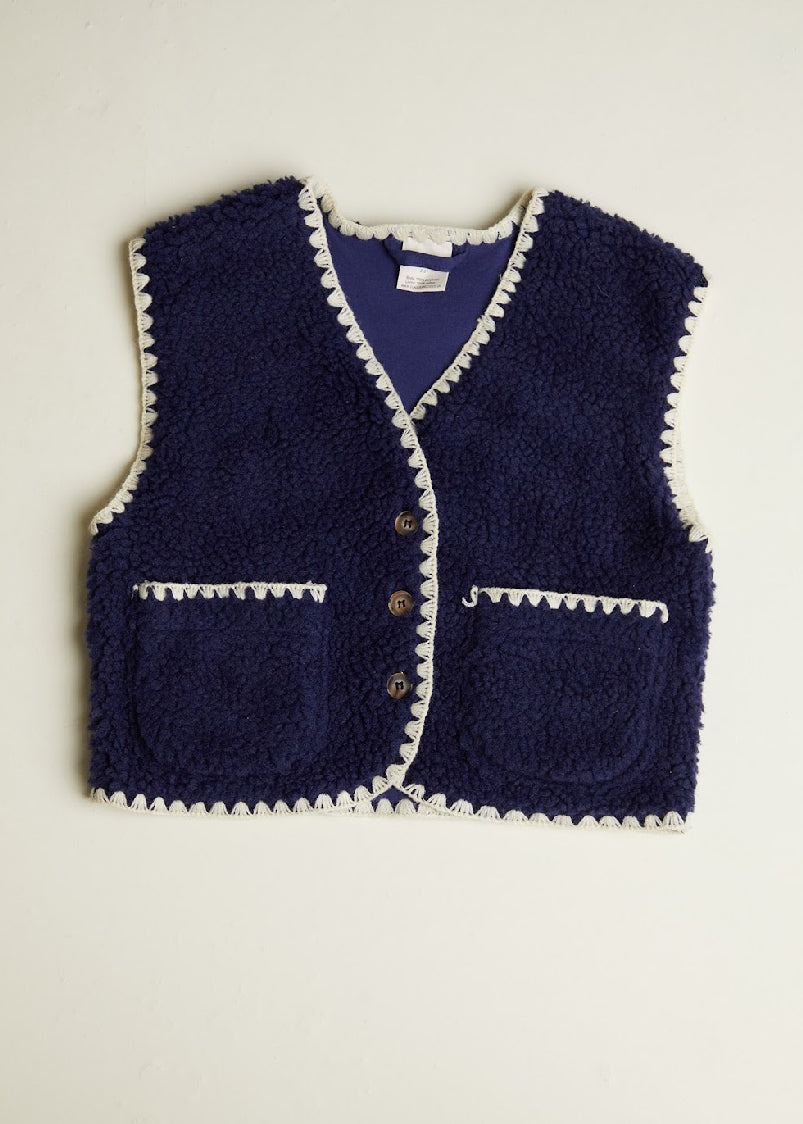 A classic twist on our best-selling, iconically oversized, unisex gilet; this time with folk-inspired stitching. We introduce ourAmos Folk gilet, available in Midnight Navy or Sand, with playfully oversized pockets, smokey tortoiseshell buttons, and branded boldly on the back.