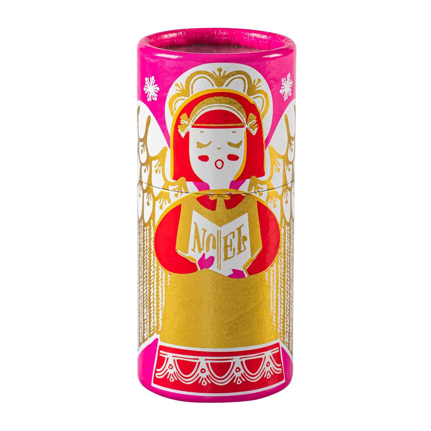 These large cylinder matches with a bright pink background featuring a singing angel holding a hymn book with the words 'Noel' written on the front.