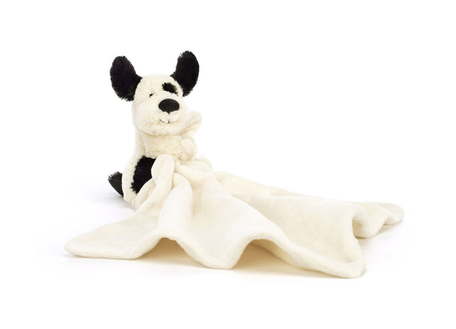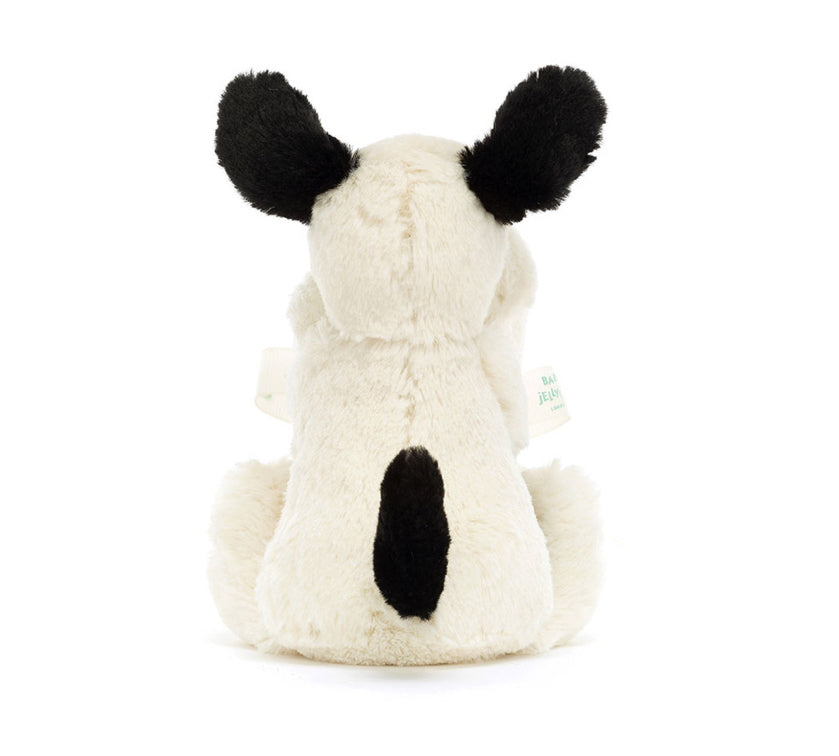 The Bashful Black & Cream Puppy Soother is a honeycomb comfort in baby-soft fur. This floppy-eared pup holds a little blanket, ideal for naptime, chewing and cuddles. All tied up with a satin ribbon, it's a beautiful gift for newborns.