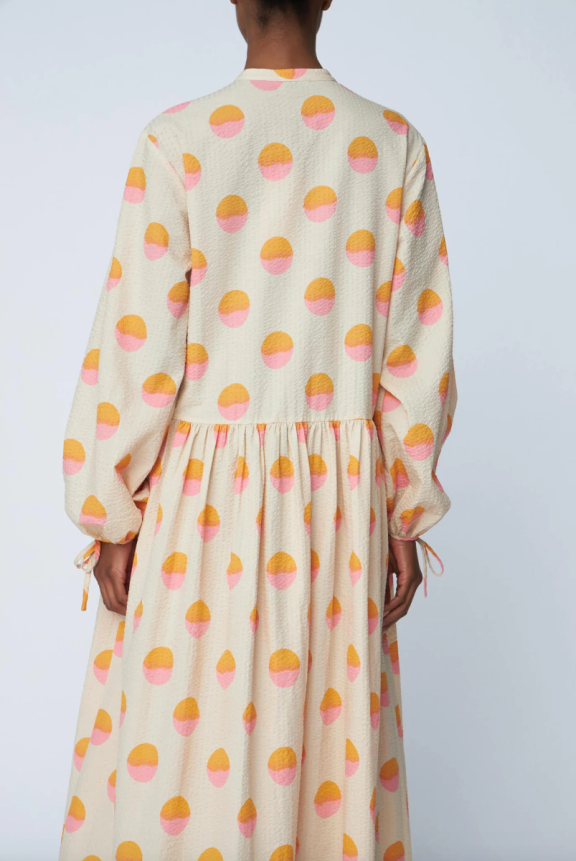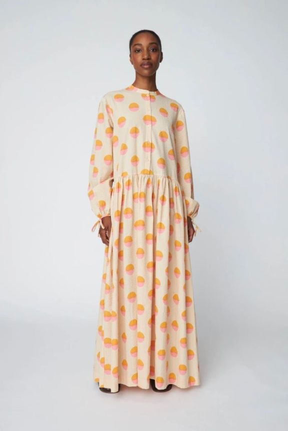 Long dress with a round neckline and front button closure. The dress features long sleeves with tie details at the wrists. The dress is loose with a lightly gathered waist for added volume.