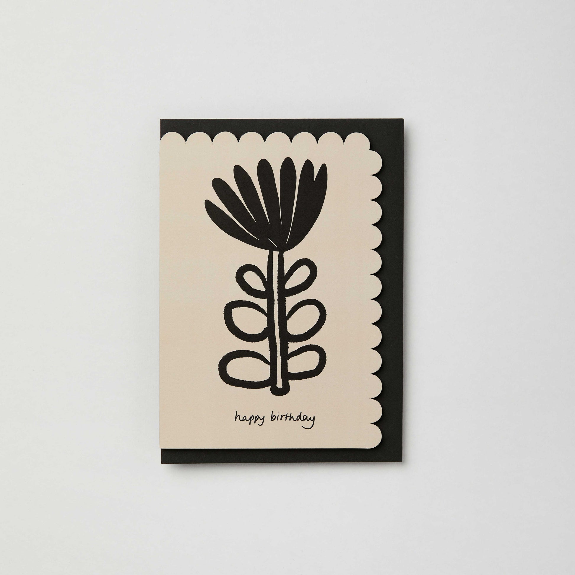 a lovely birthday card featuring an abstract dhalia and mini scalloped edge. Sand or beige in colour, the design is printing in black. Comes with a Kraft or Charcoal envelope. Printed sustainably in the UK using paper from well-managed sources.