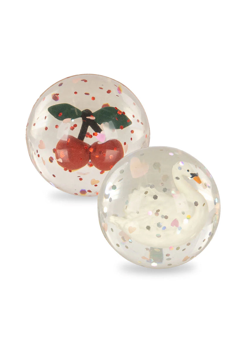 These transparent bouncing balls with 3D Konges Sløjd signature figures and glitter inside are made for hours of fun and play.