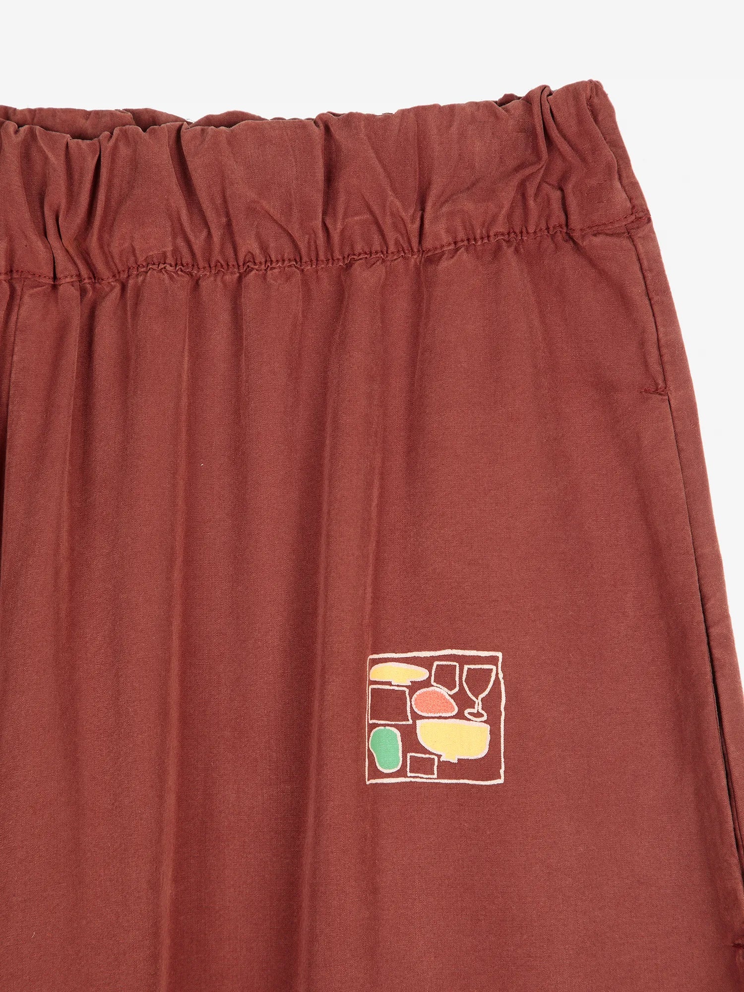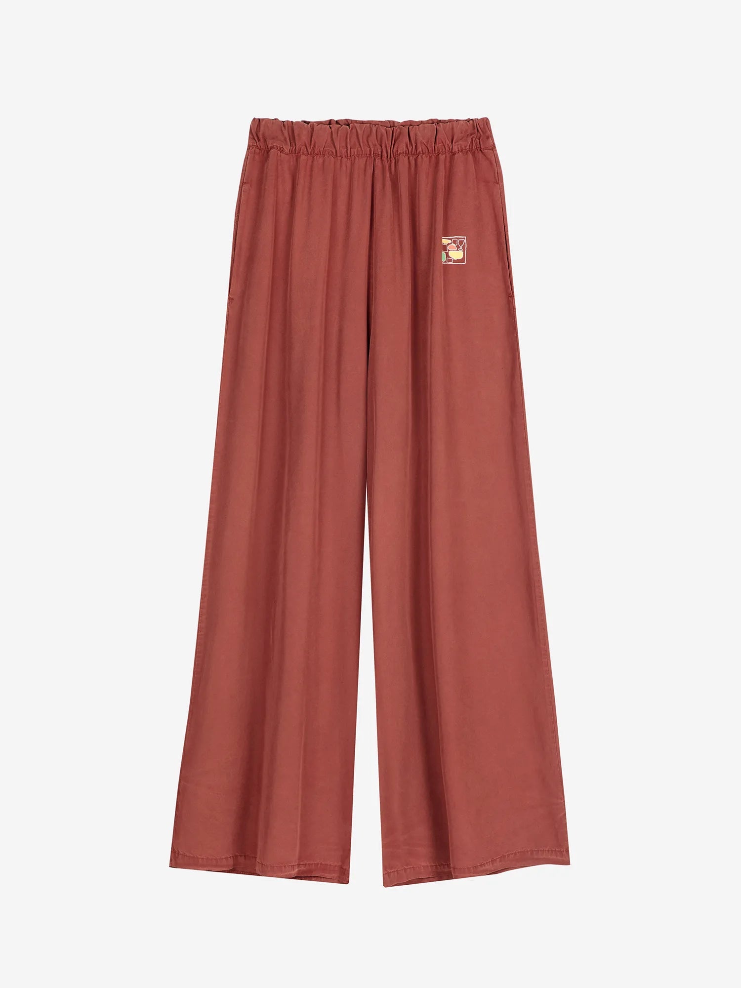 Burgundy red pants. Designed with high-rise, cut for a wide-leg fit, elasticated at the waist for a flexible fit, maxi length, non stretchy fabric, lightweight fabric and designed with pockets. Fits true to size, take your normal size. Made in Spain.