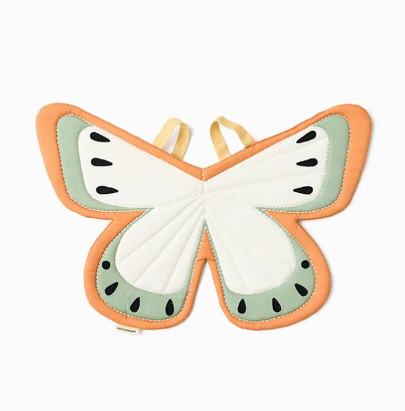 "Butterflies drift on soft breezes, their delicate wings painting the air with gentle motion." These butterfly wings are designed to be worn on the back with elastic shoulder straps, making dress-up simple and comfortable. The wings are padded to hold their shape during play, and the embroidered details add stability and texture. Dress-up play helps children explore their creativity and storytelling skills, and wings like these encourage active movement as they pretend to "fly." This simple design makes it easy for children to put on by themselves, supporting independent play.