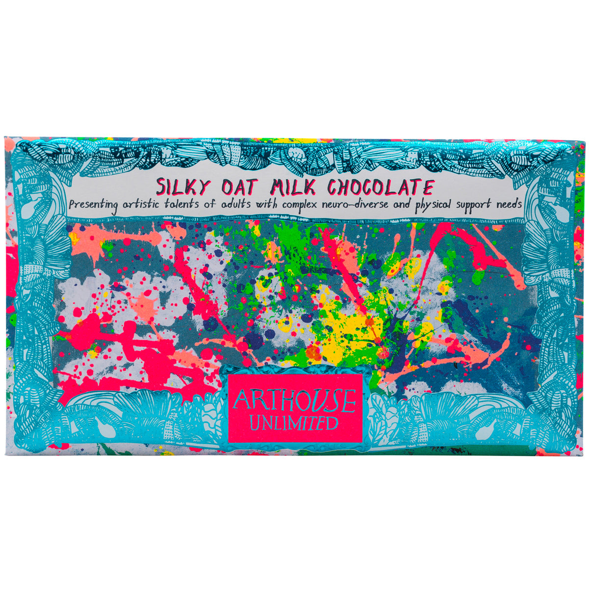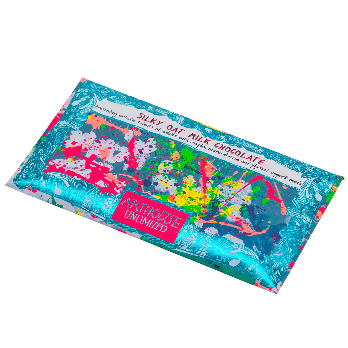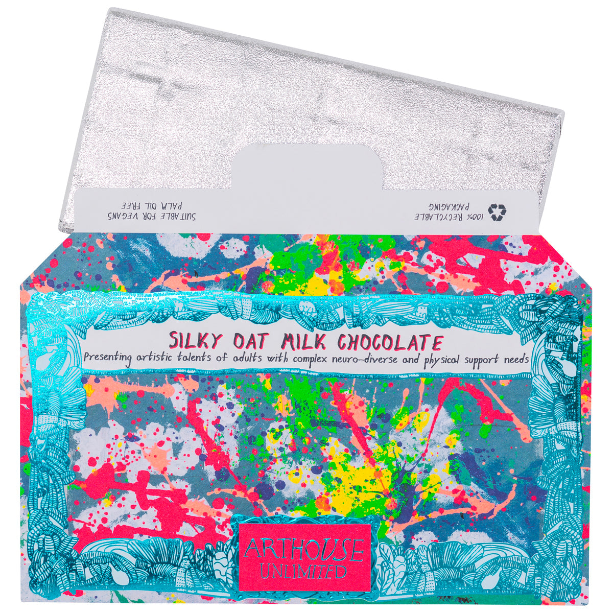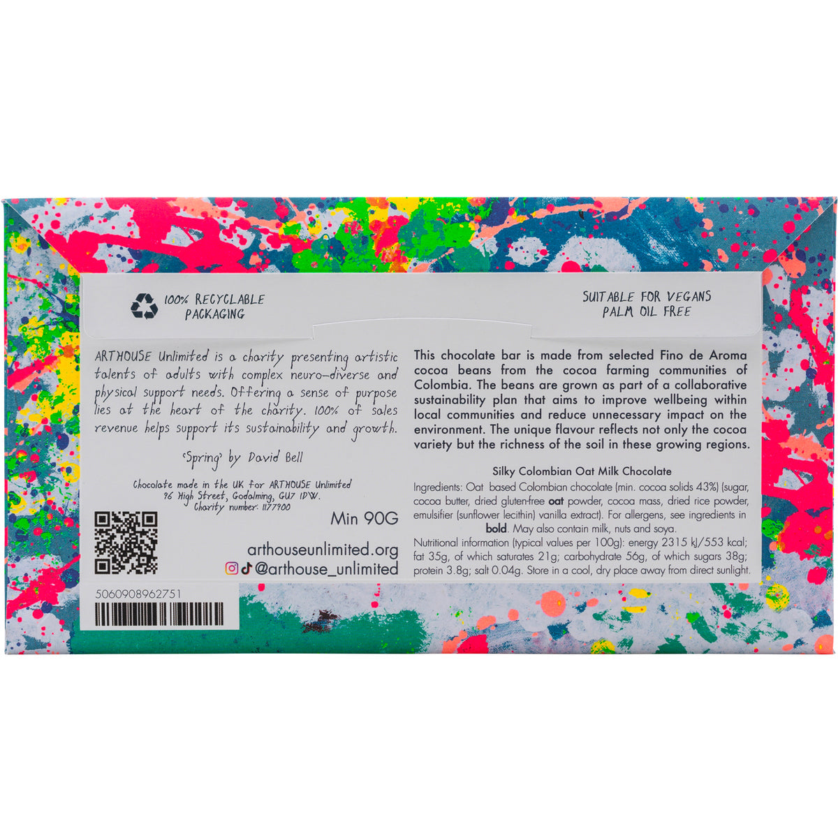A delicious naturally sweet, vegan friendly Oat Milk Chocolate Bar. Made in the UK with responsibly sourced cocoa, this bar features David Bell's original artwork Spring presented in a dazzling turquoise frame. Wrapped in coloured foil & encased in a recyclable envelope, An ideal gift for chocoholics, art lovers & good-cause supporters everywhere!