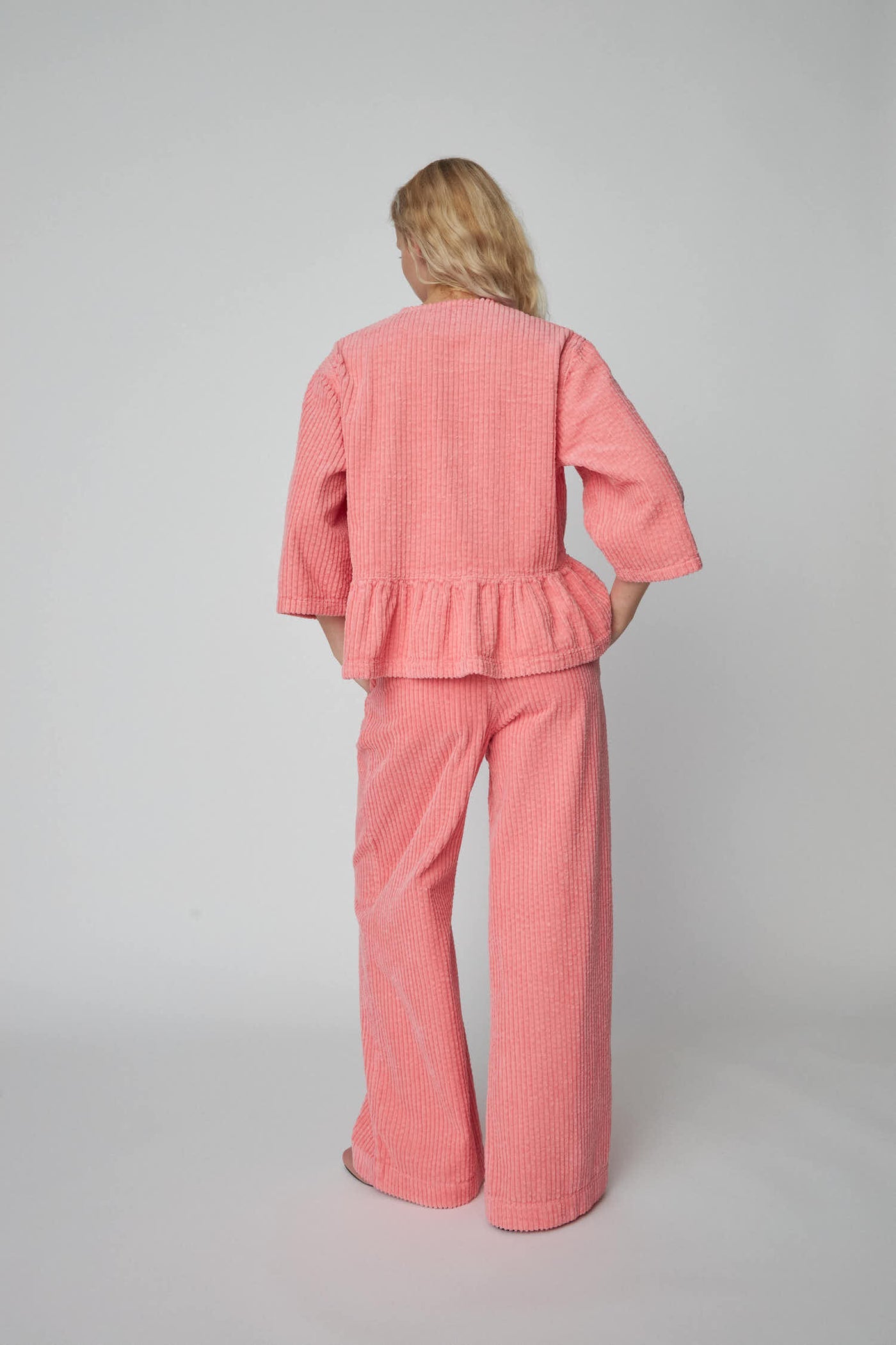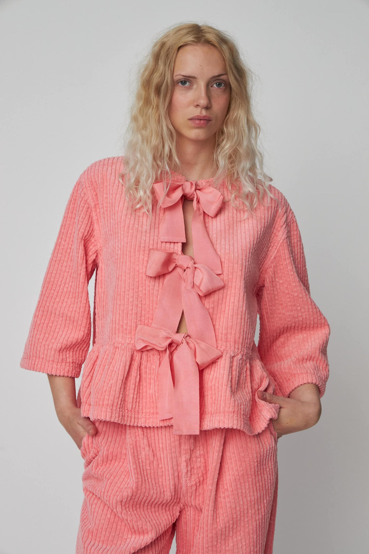 Wide-ribbed corduroy jacket with front ties and wide sleeves. The jacket features a gathered detail at the bottom and ¾-length sleeves.