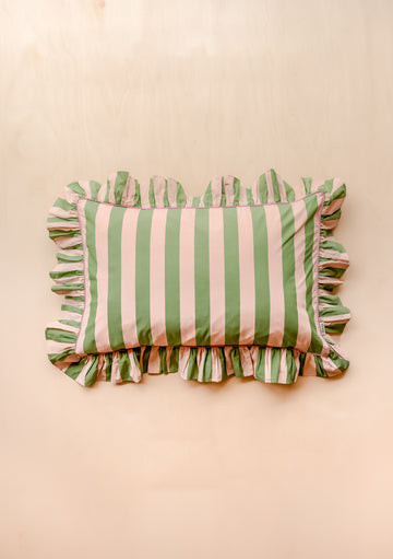 Revive your bedscape with a pair of green pillowcases featuring a stripe pattern and ruffled edge. The cotton is skin-friendly and breathable, ensuring a peaceful night's sleep. Best paired with cosy evenings and slow mornings. Dust bag included for easy storage. Mix or match with our collection of duvet covers.
