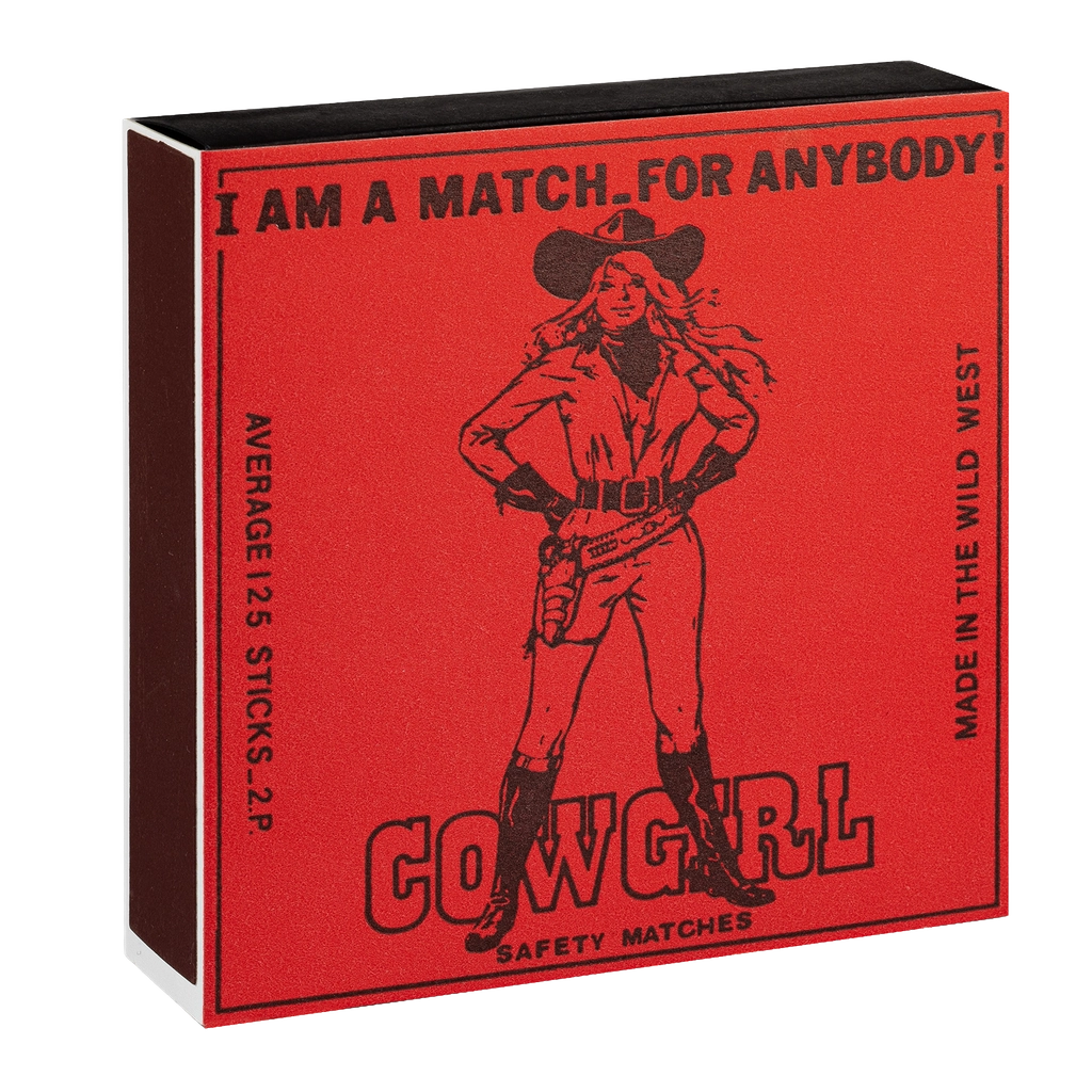 Archivist signature square matchbox featuring a cowgirl with her hands on her hips on a bold red background with the words 'I'm a match for anybody, Made in the Wild West, Cowgirl Safety Matches.'
