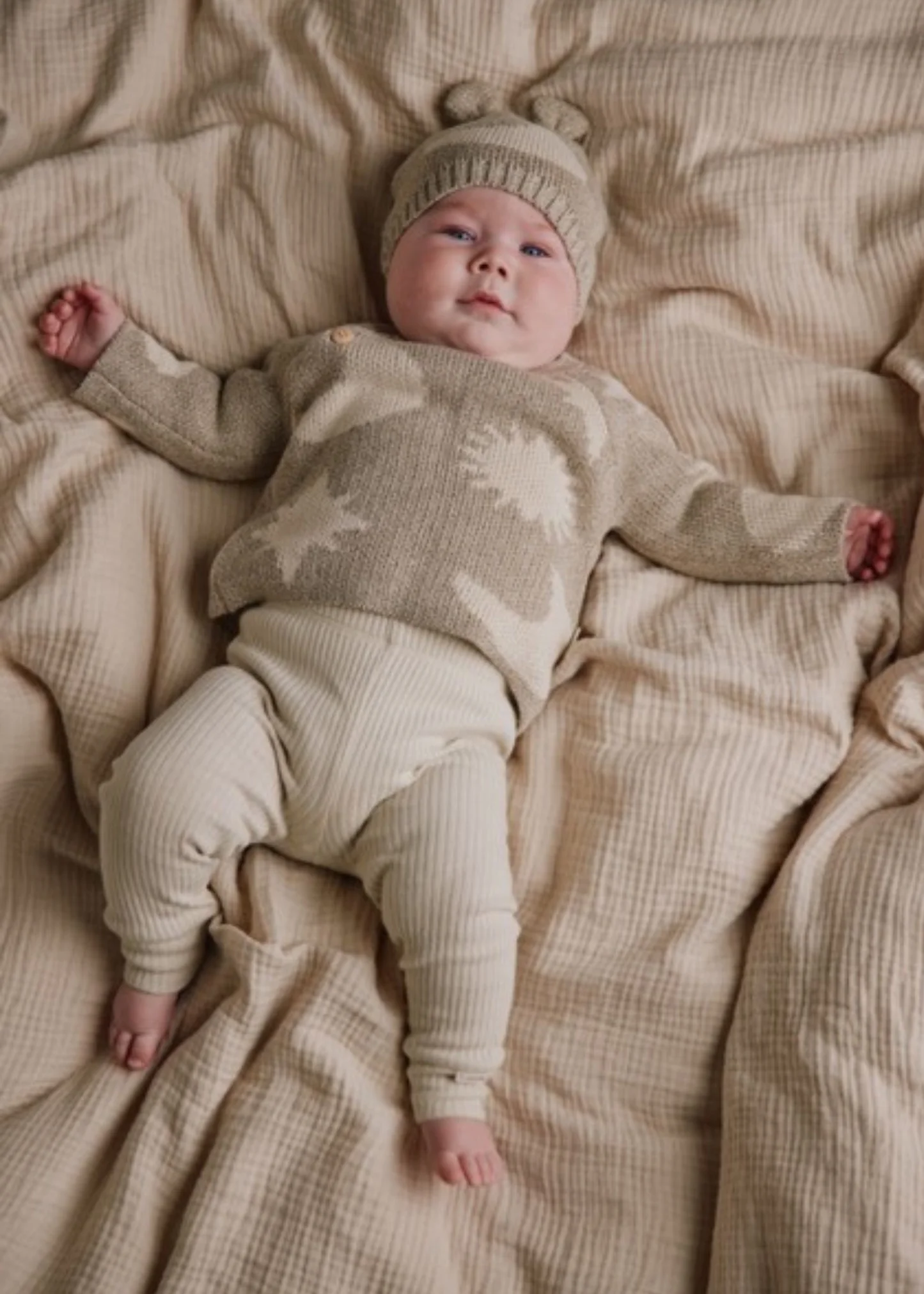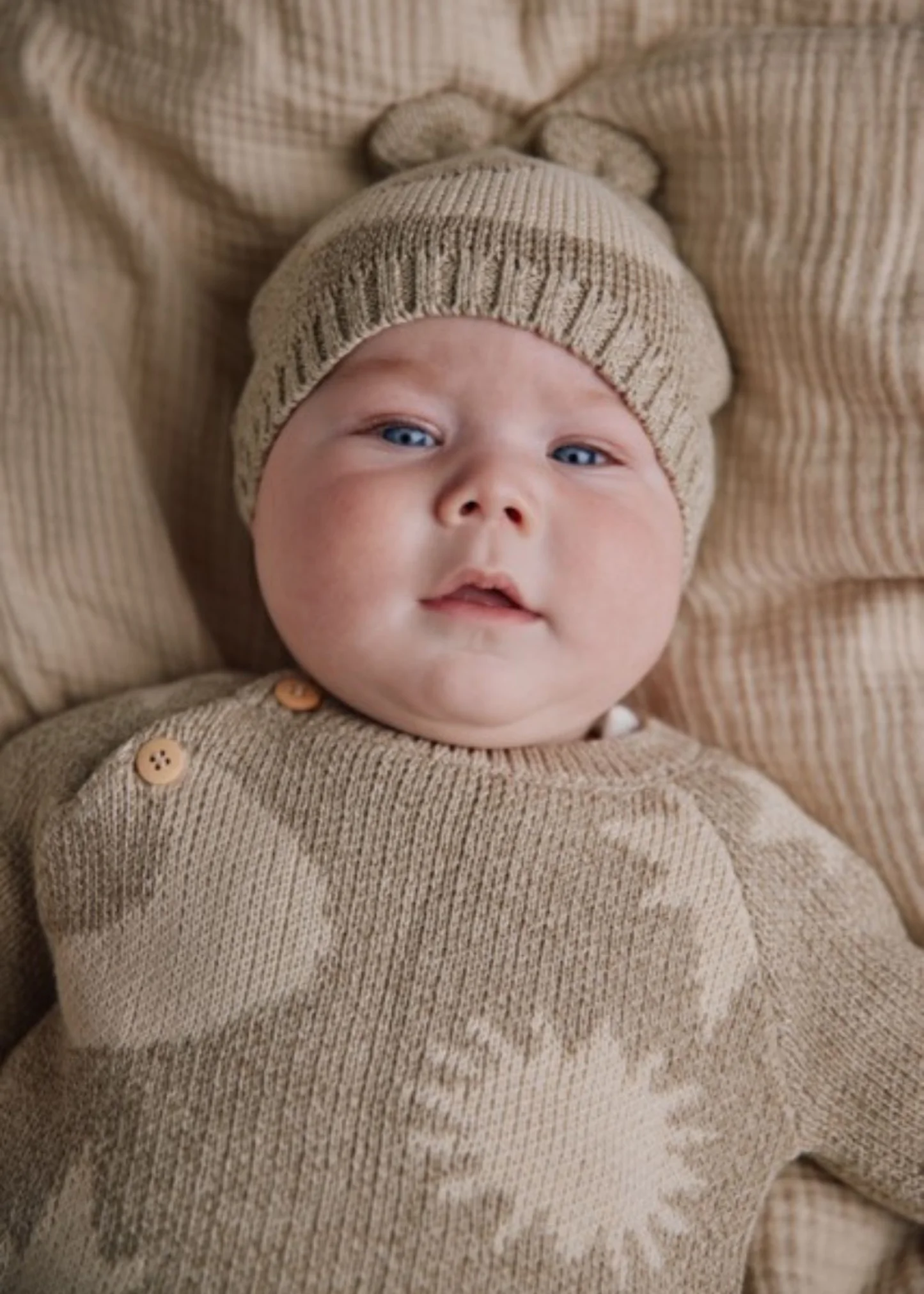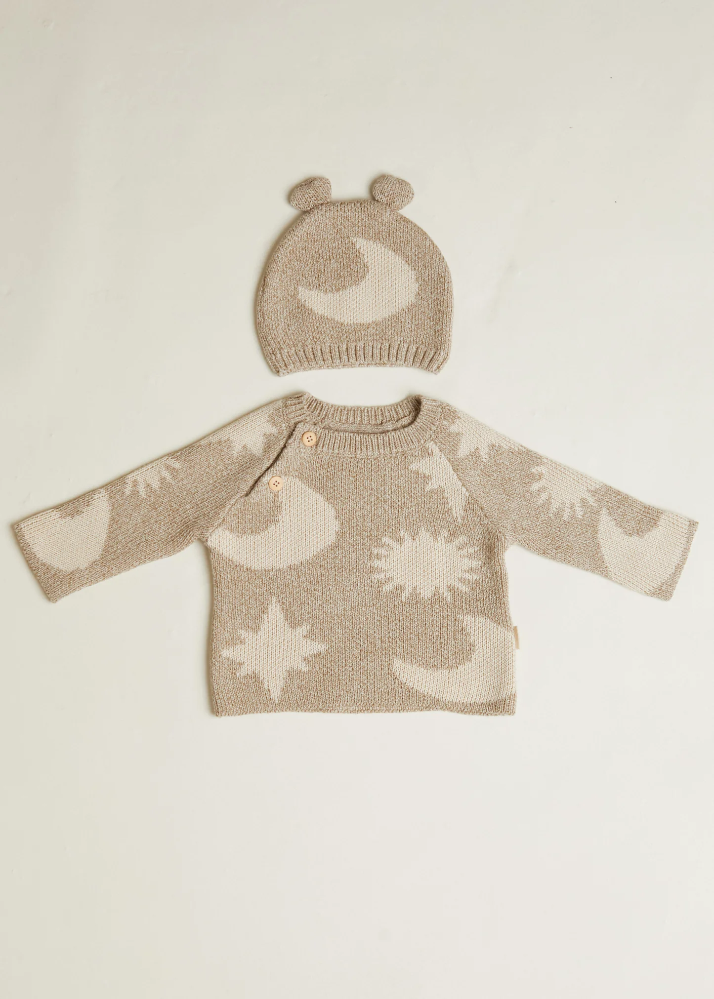 A beautifully crafted two-piece baby set made from 100% organic cotton twisted yarn. Designed with a neutral colour palette and celestial pattern, this set includes a jumper with button neck detail and matching hat, complete with a branded fabric bag for the perfect finishing touch.