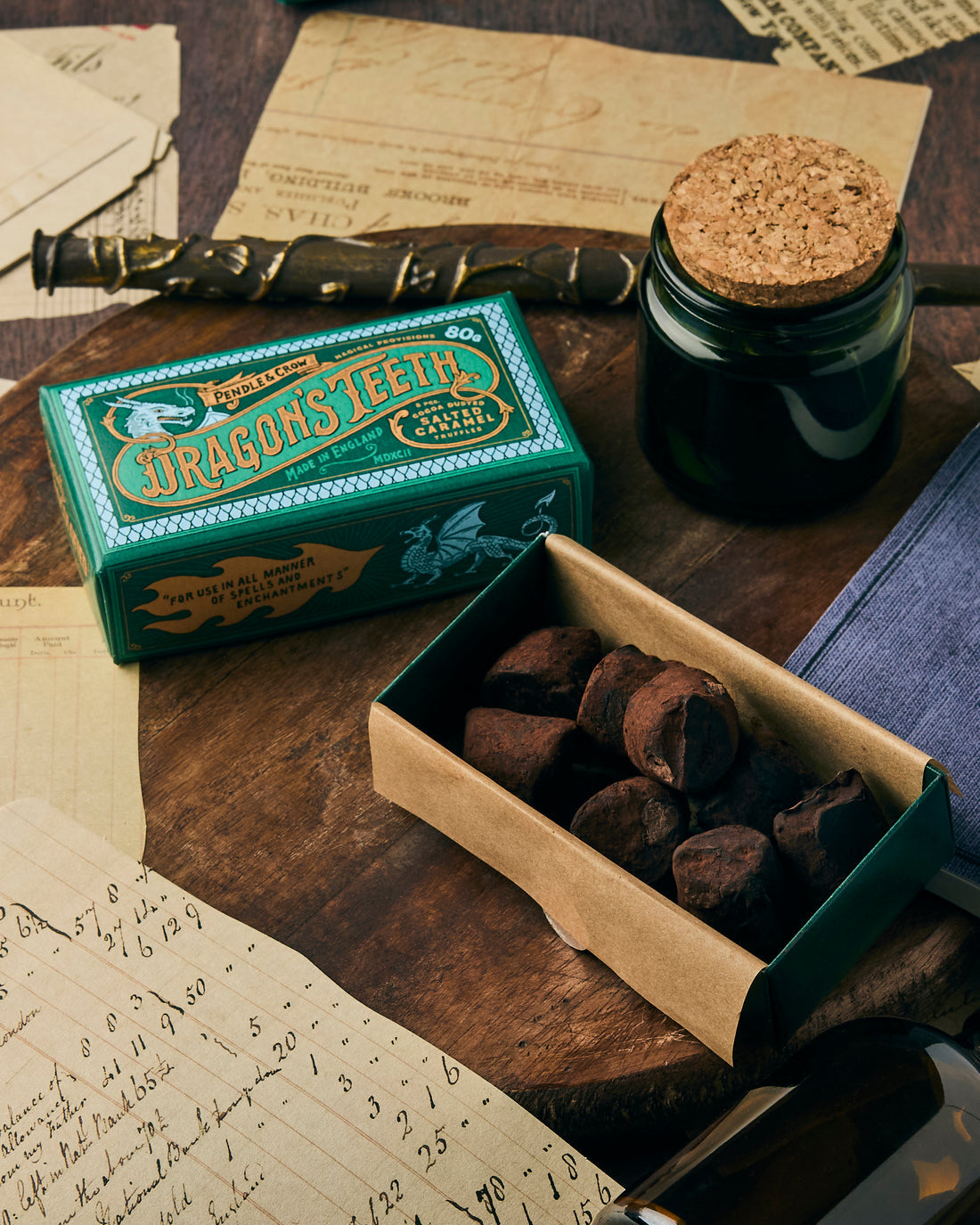 Lift off the lid of this truly beautiful emerald green, hand illustrated box. Peel back the layers of brown paper and inside you will find, eight dragons teeth! (Or…extremely luxurious cocoa-dusted salted caramel truffles)