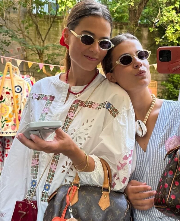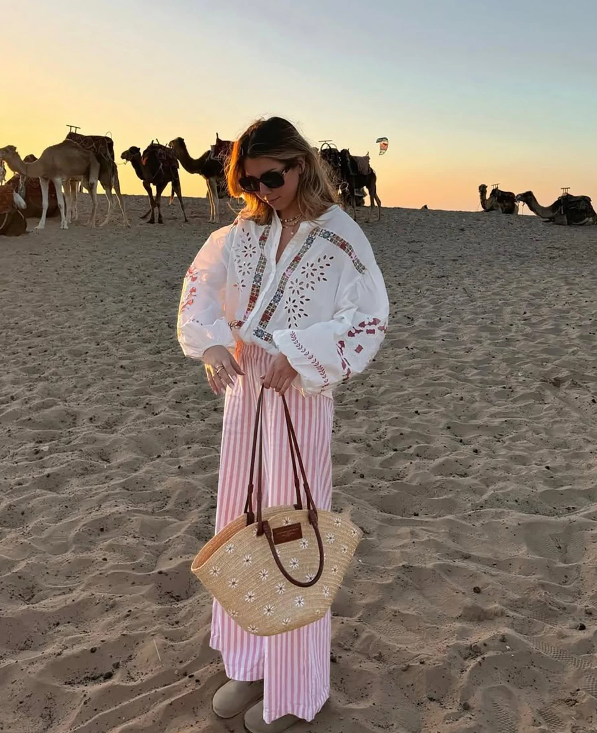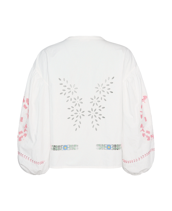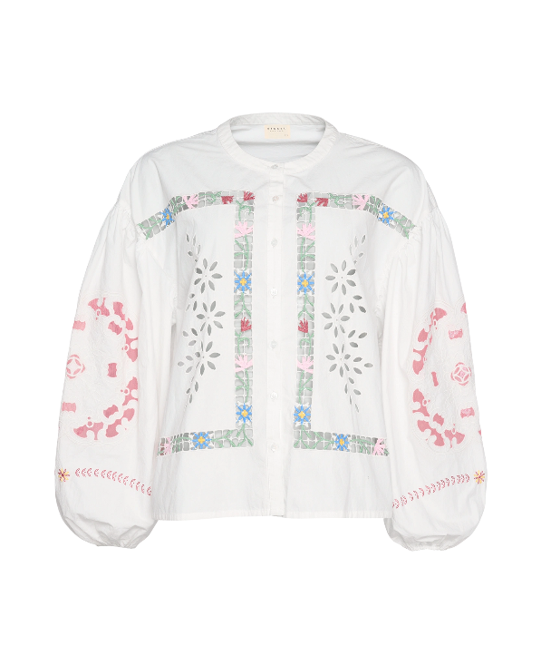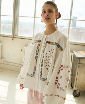 It features dropped shoulders and is decorated with mesh details and embroidery in contrasting colors.