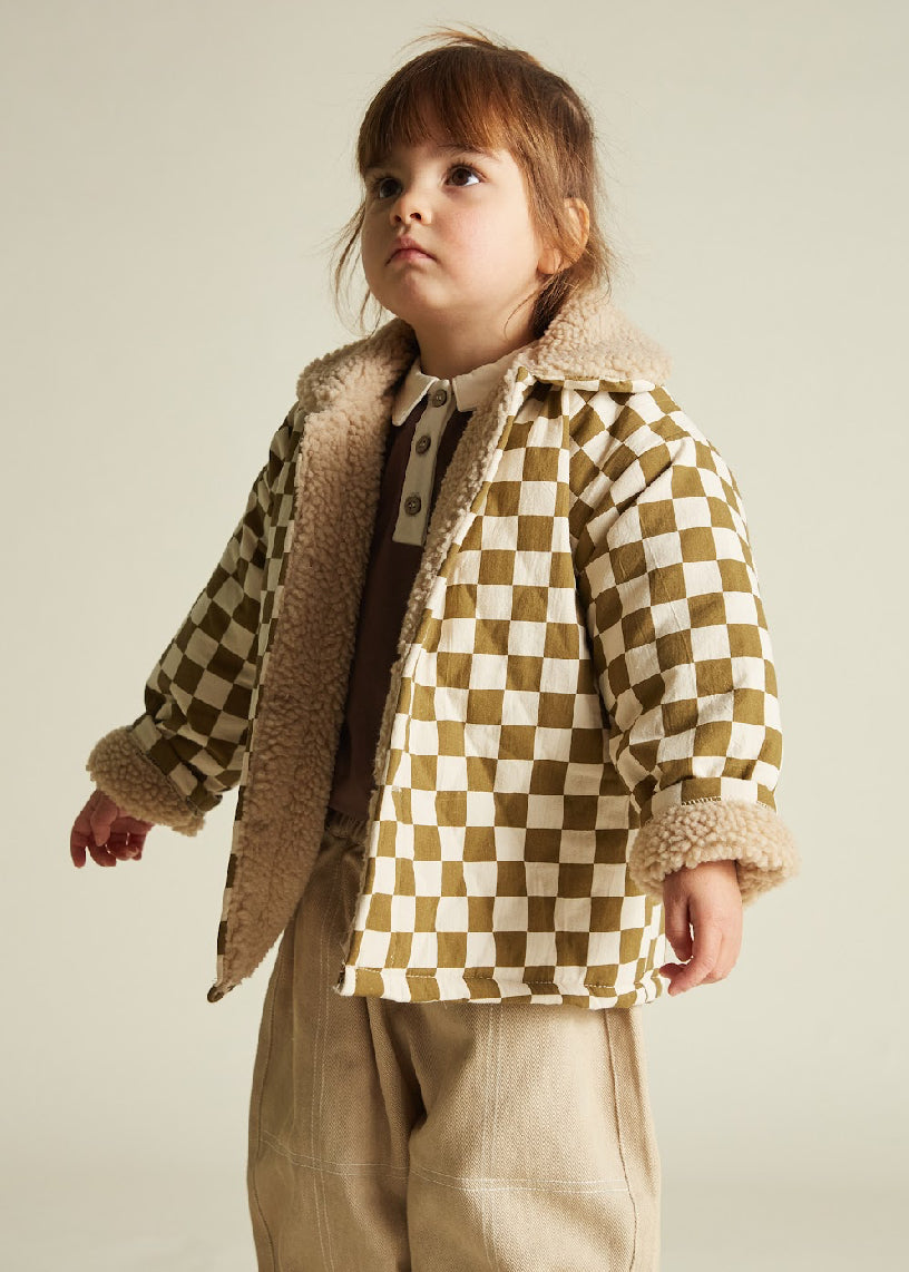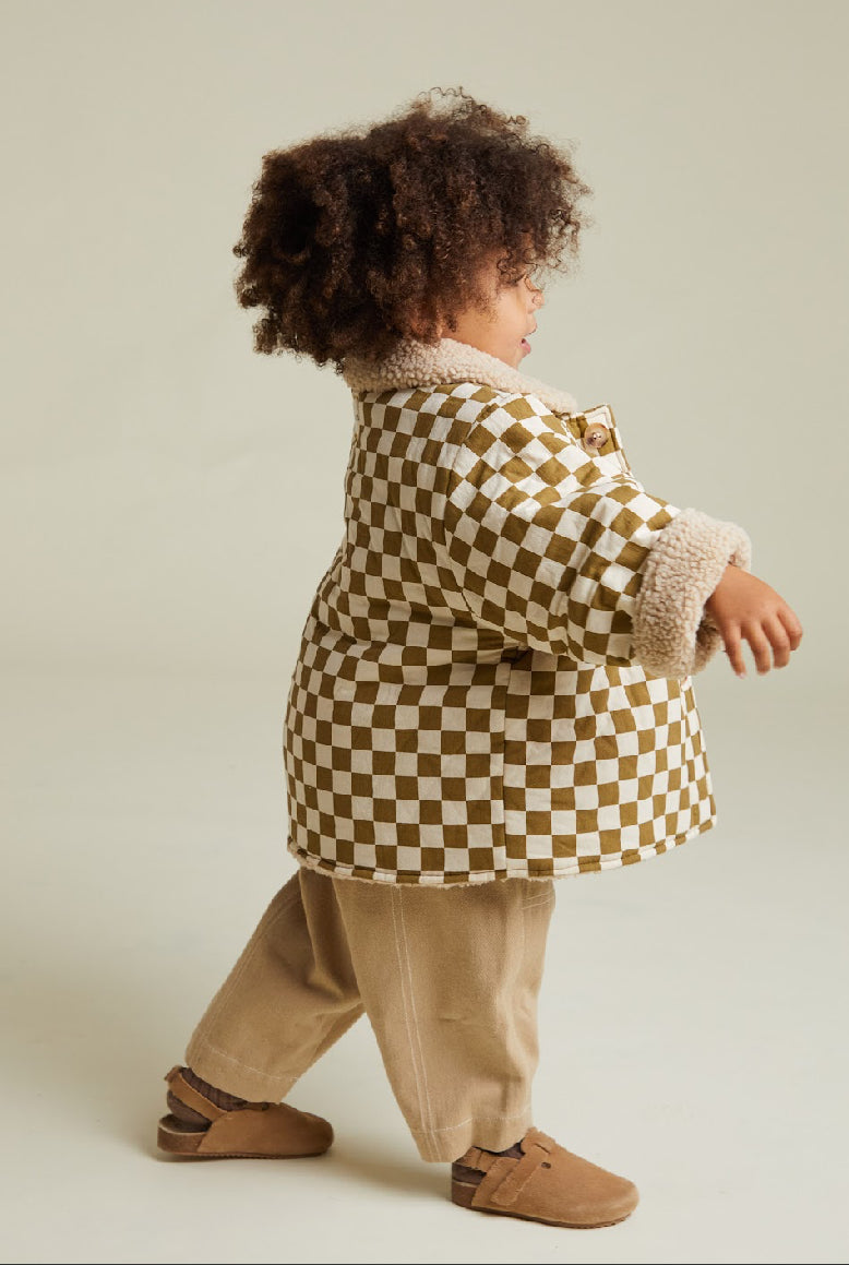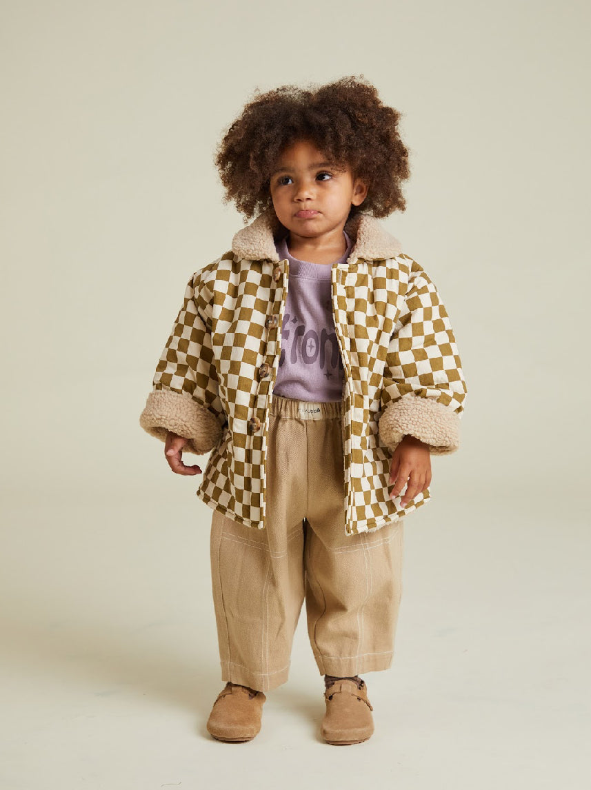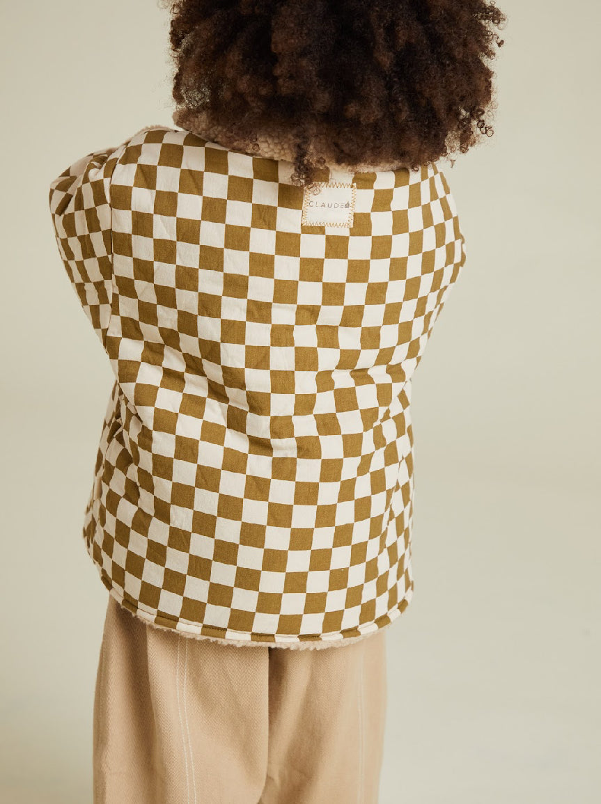 Crafted with a 100% cotton outer in our iconic checkerboard pattern, our Emery jacket is fully lined with soft oatmeal borg for warmth and quilted polyester sleeves for easy layering. Large smokey tortoiseshell buttons, side pockets, and turn-back cuffs add both function and style, all finished with Bold Claude branding (of course!).