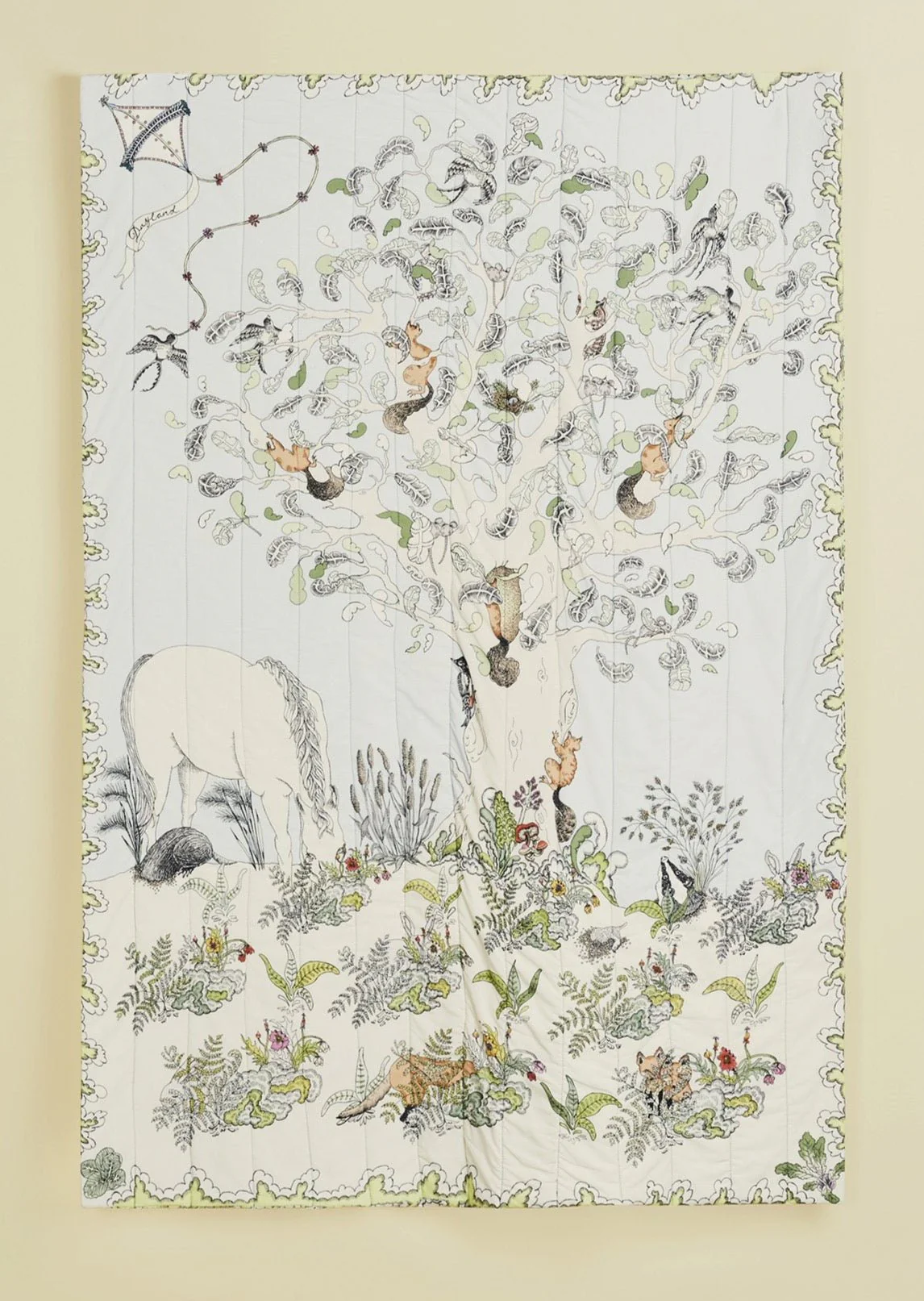 Our soft organic cotton Enchanted Forest Quilted blanket will transport your child on a magical journey from daytime to nighttime. Turning over the reversible blanket will reveal a magical nighttime scene where the wildlife from Dayland has transformed into mythical creatures you might meet in your dreams. Made from luxurious 318 thread count cotton satin, our hand illustrated bedding has been created to provide special memories for childhood.