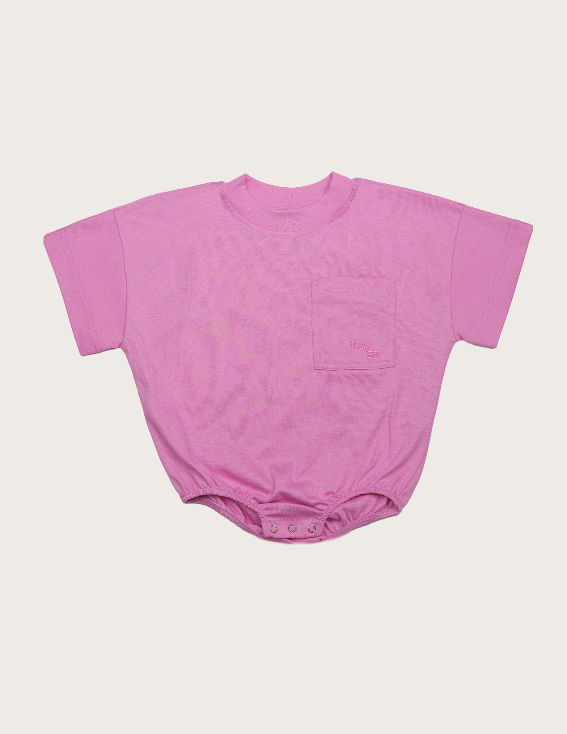 The Frankie romper is our oversized t-shirt baby romper, designed in a relaxed cocoon silhouette for ultimate comfort and room to grow. It has a self-fabric neck trim, elasticated leg openings, concealed press-buttons for easy dressing.