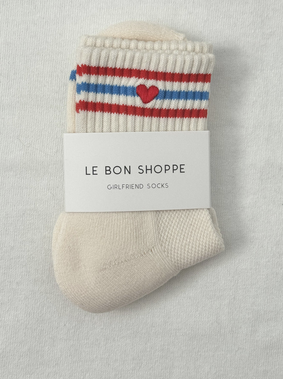 Say hello to the cutest crew socks to exist. Similar to the Boyfriend Socks, except with a short leg that fits true to the classic crew length. Under the classic triple contrast stripe sits an embroidered heart, adding the sweetest touch of affection to any outfit.