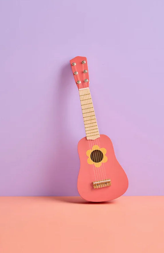 Why not let them create some music of their own? Your child can perform solo or team up with friends and family to put on a fun concert for Teddy or the whole crew. It's a great way to share the joy of music with everyone around. Key Features: • A toy that fits right into your décor. • Available in different designs and vibrant colors like Dark Pink, Green, Blue, etc. The strings on this wooden toy guitar can be strummed just like those on a real guitar so your child can explore musical sounds and rhythms. This guitar expresses joy and happiness with its dark vibrant pink and the yellow cartoon-inspired daisy flower. This toy is a fun introduction to your child's first steps into music.