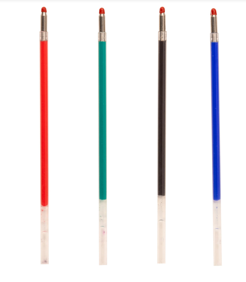 Set of 4 bullet tip, erasable gel ink refills for INK27-A. Includes: black, blue, green, and red ink.