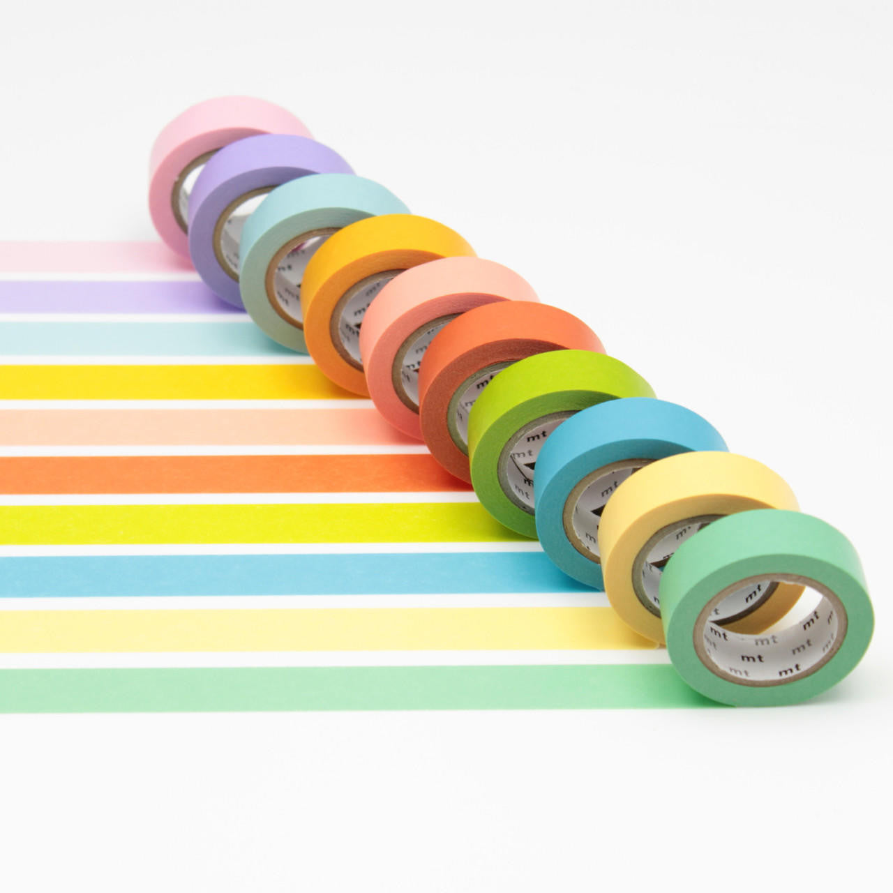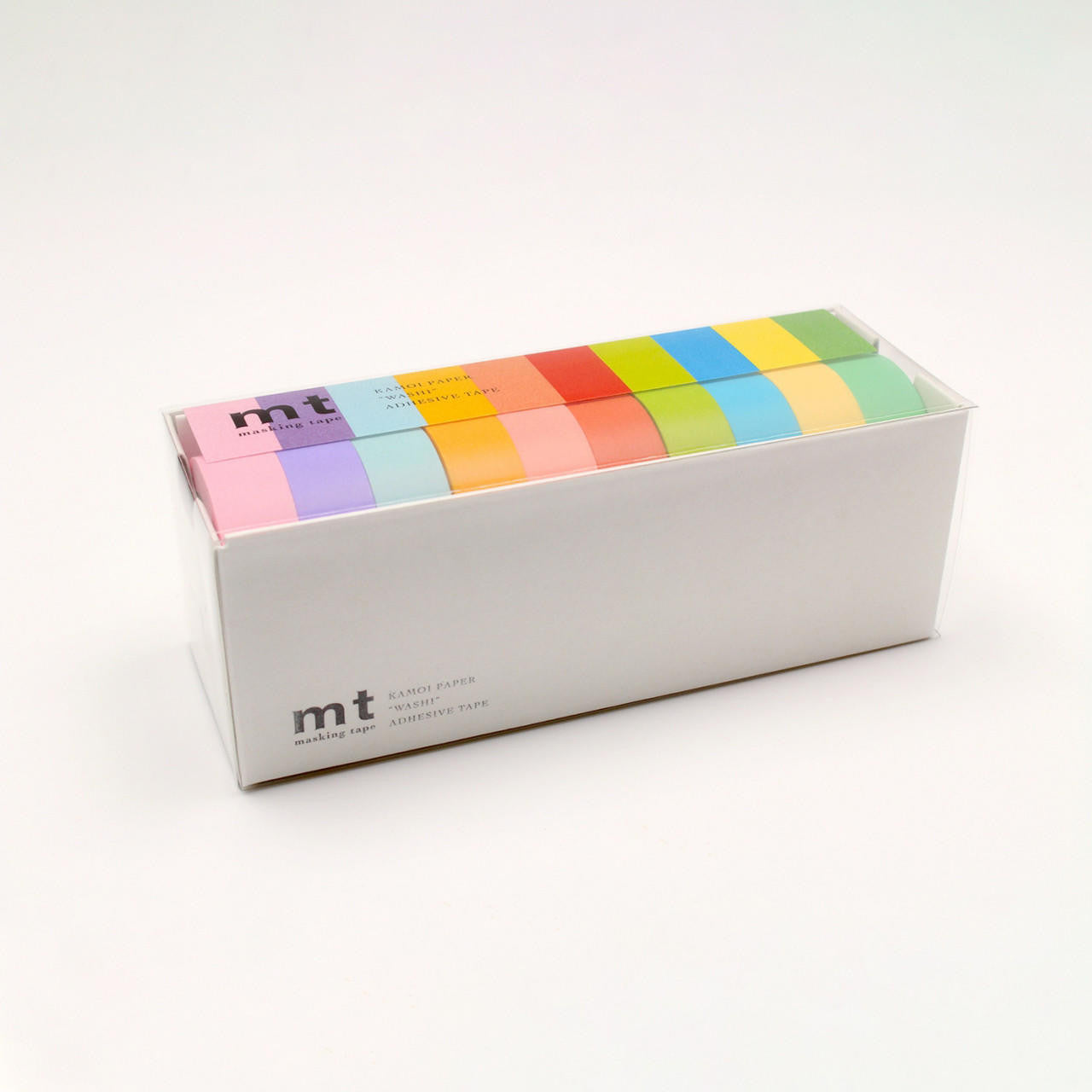 This set contains 10 fun assortment of light rainbow hued washi tapes in a gift box, a perfect gift for craft lovers or a great place to start your own washi tape collection.
