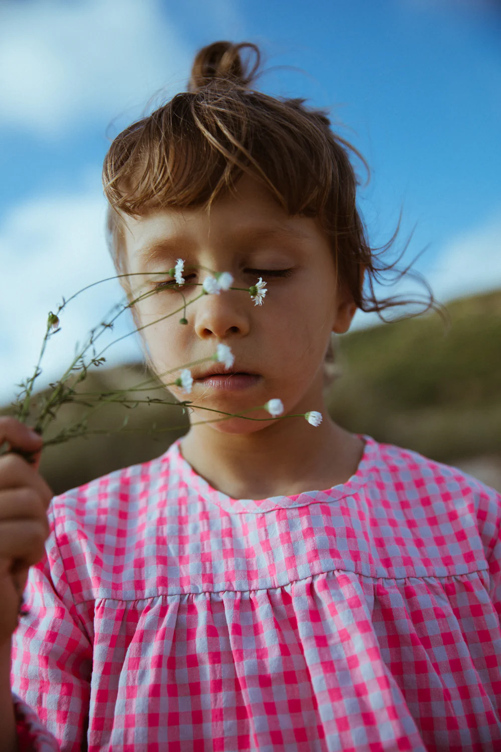 A children's set in a Hot Pink & Grey Gingham, featuring a vintage inspired button-back blouse and elastic balloon trouser. We think this set is good enough for day-wear!