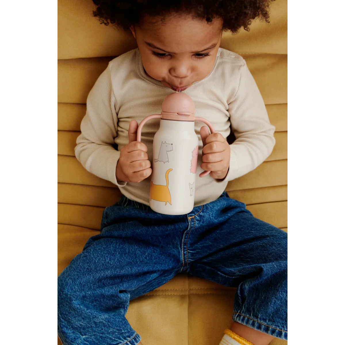 Innovative and toddler-friendly, the KIMMIE water bottle has two easy handles on the lid, a built-in straw and is made of 80% recycled premium stainless steel. It is designed to be easy for little hands to handle when learning to tilt and drink water on their own.