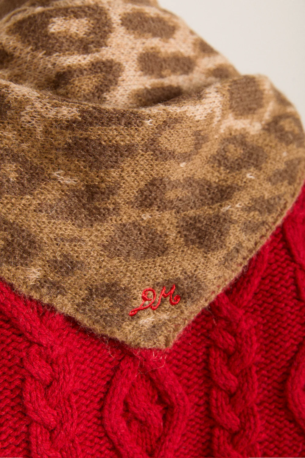 A statement accessory with versatile styling options. This knit headscarf features the signature DM leopard design, finished with contrast red DM embroidery for a bold touch. Pair with the matching mittens for a coordinated look.