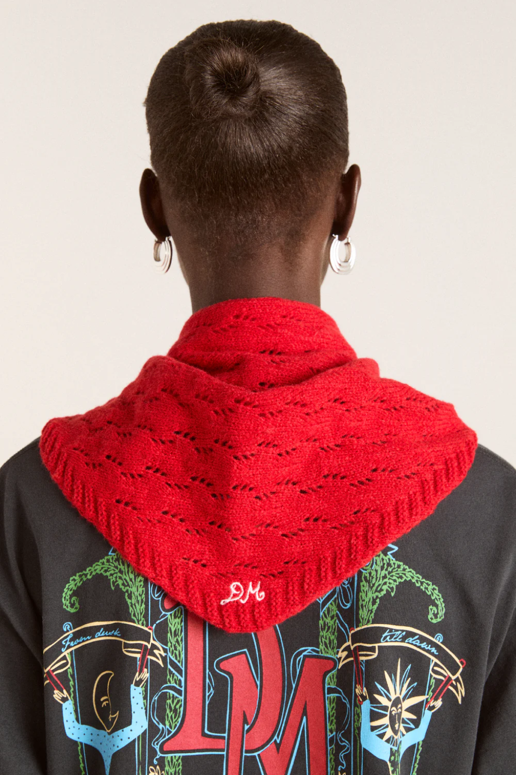 A delicate statement accessory in a vibrant red pointelle knit. Measuring 140cm x 42cm at its longest points, this versatile piece can be worn as a headscarf or draped gracefully over the shoulders. Finished with a crisp contrast white DM embroidery for a signature detail.
