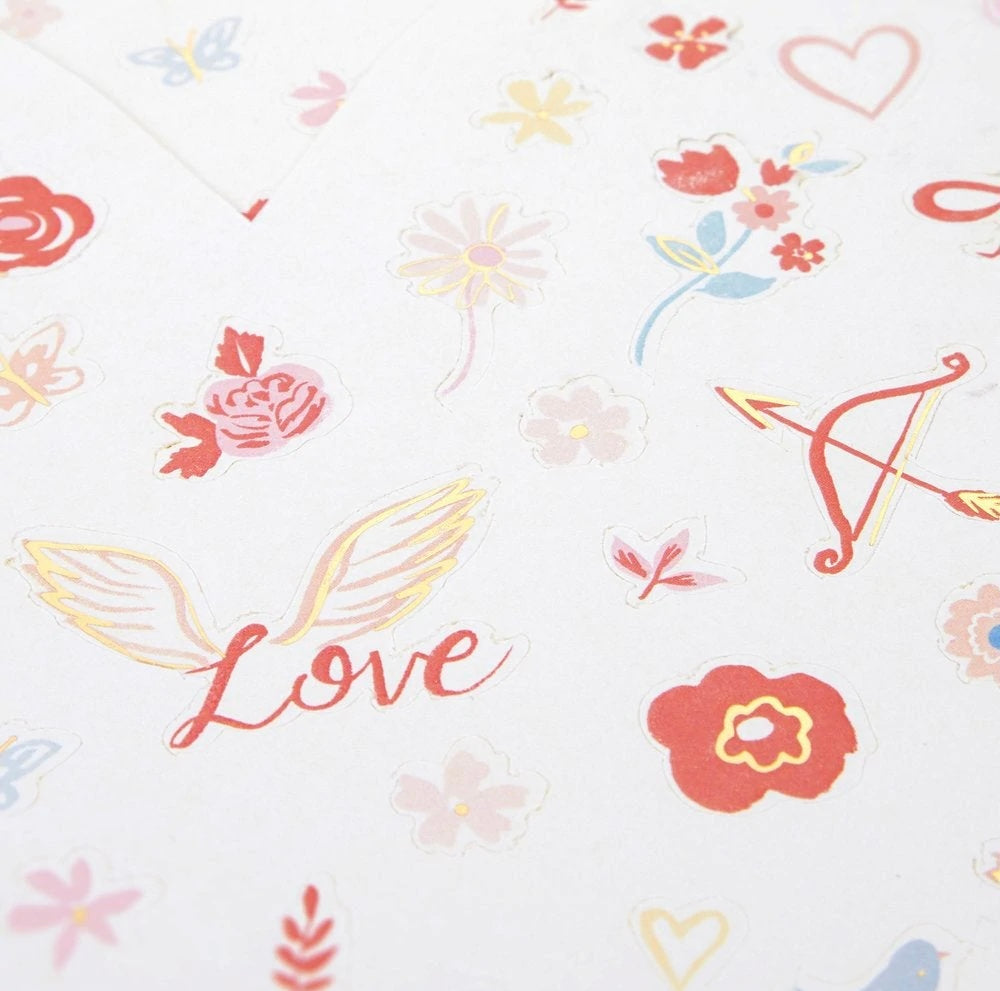 - The mini stickers feature flowers, cupid's arrow and the word “Love” with wings