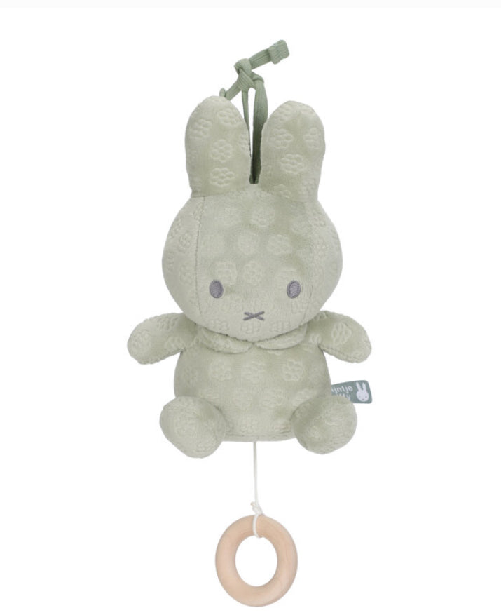 miffy, sweet little bunny. play the melody of the well-known miffy tune by pulling the string. due to the soft fabric, with punched flowers, this music box is a real asset for the crib or playpen. the music box is easy to attach using the loop.