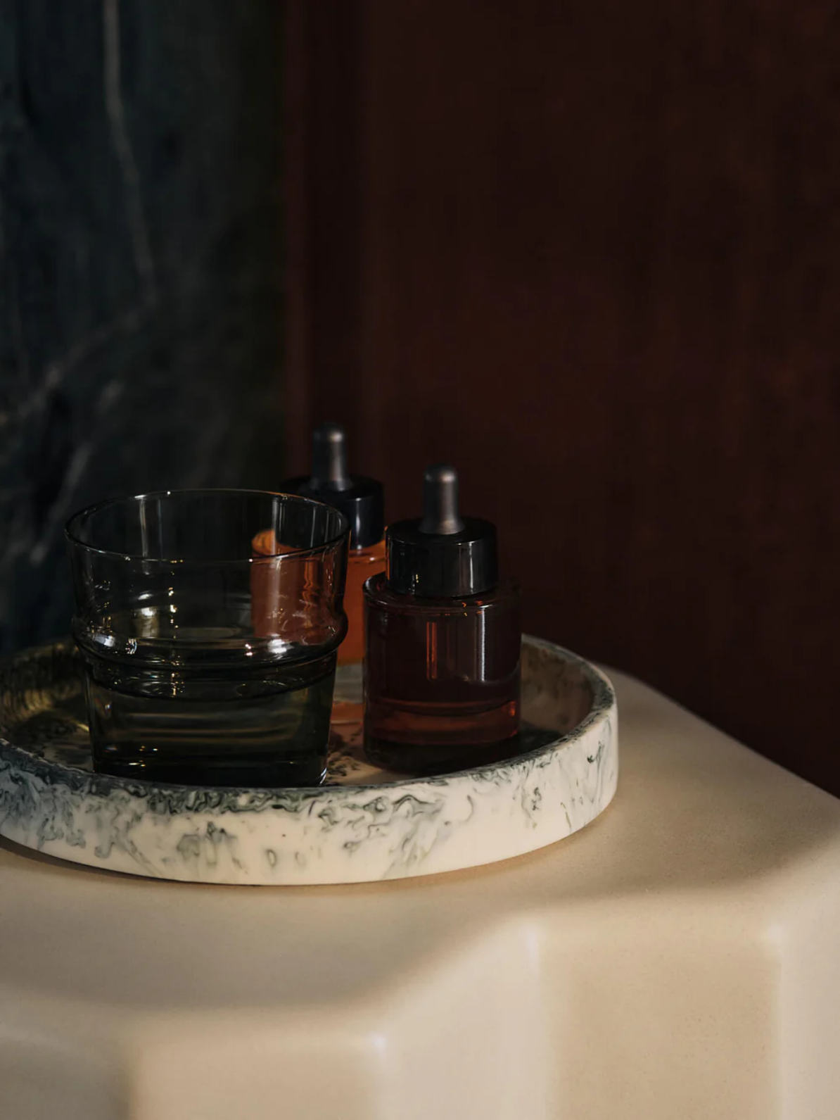 The Mist Tray is presented in a round format, offering a softer take on its sculptural expression. Crafted from a resin blend with swirling, translucent tones, each tray is unique in its expression. The Mist Series is ideal for displaying self-care items, jewellery or everyday treasures, adding a subtle sculptural touch to any room.