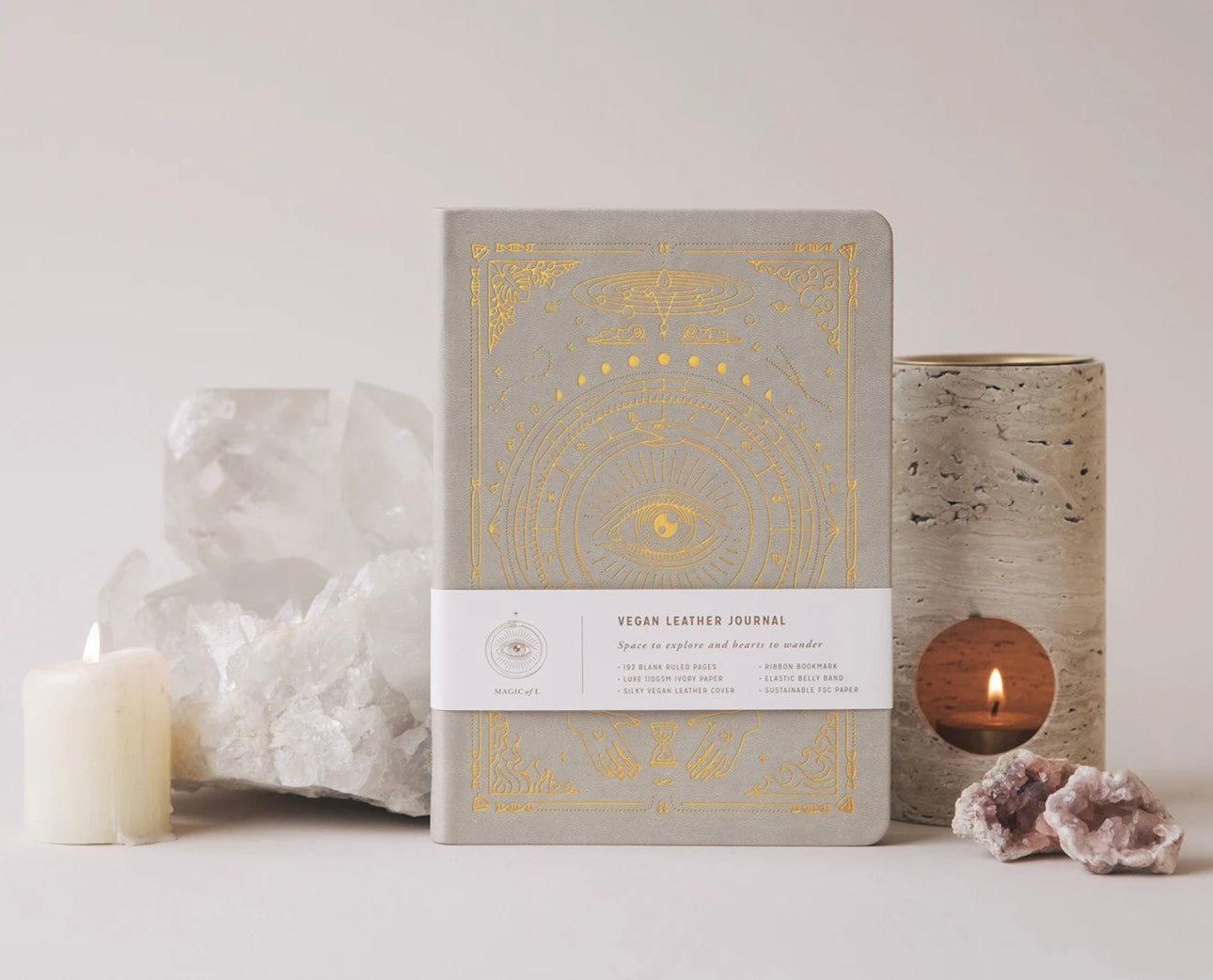These luscious 192 page lined journals are the premium complimentary companion to your own planners, or as a stunning stand alone diary for all of your journalling purposes. It's silky smooth vegan leather cover is buttery soft to touch and the lined pages are smooth and robust. A matching ribbon marks your place and the holographic edges makes opening and closing this journal a treasure from beyond. No expenses spared when it comes to keeping your thoughts and intentions in one special place.