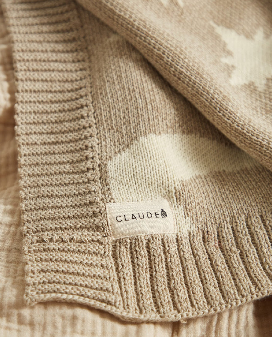 Introducing your new favourite blanket. The newest addition to our family of knitted pieces reimagines the best-selling cozmo pattern that you know and love. In a warm, golden shade with creamy, off-white moons and stars, this knitted blanket is crafted from 100% organic cotton using our signature twisted yarn technique. It is slouchy and snuggly and the same feeling as your knitwear pieces wrapped around that precious person. Arrives packaged with Claude & Co branded ribbon and folded.