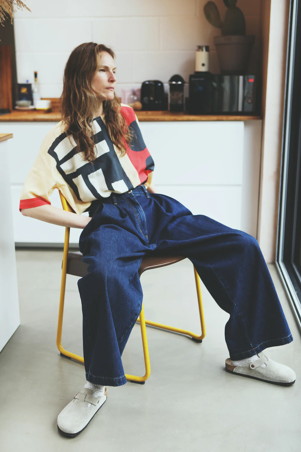 High-waisted pleat front jeans in robust, heavyweight indigo denim. Features utility pocket detailing and contrast ochre topstitching.