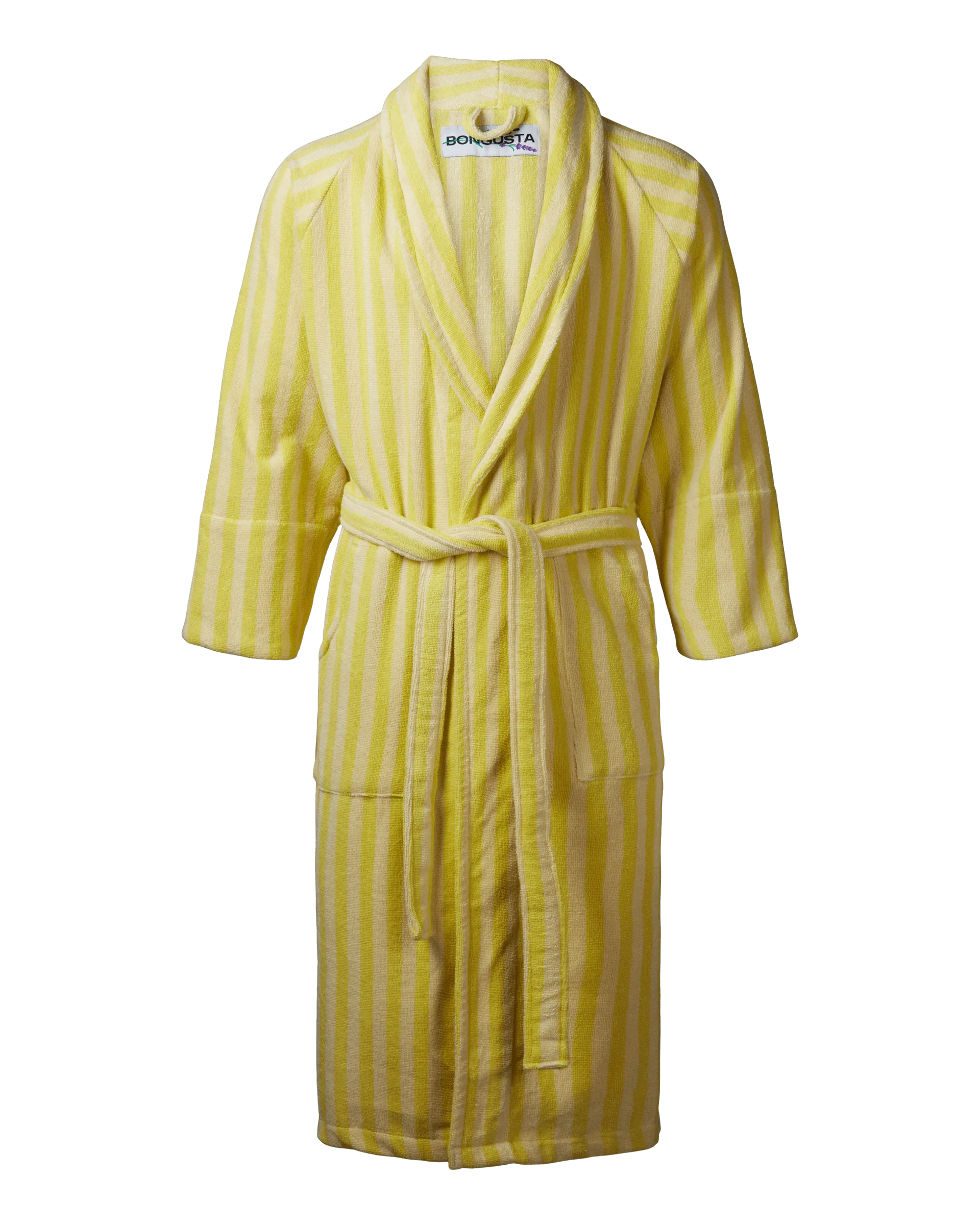 The Naram Bathrobe has a classic, but modern design with vibrant colours and stripes. The bathrobe comes with a shawl collar, open front, belt closure and two spacious pockets - perfect for relaxed mornings or just cosying up on the sofa.