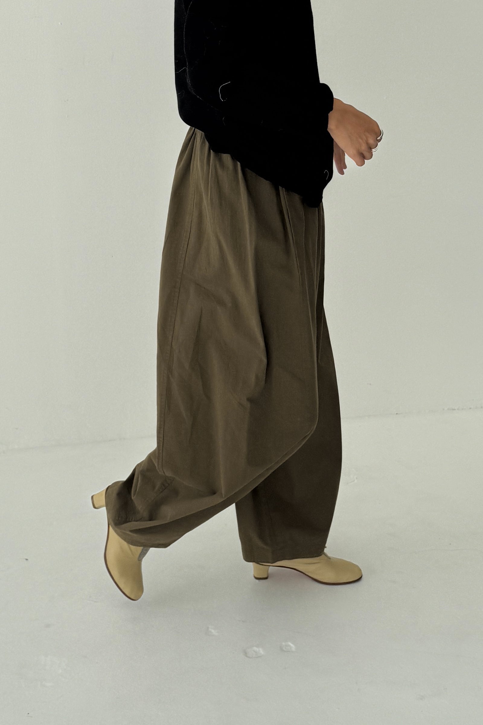 Billowy pants made to move with you throughout the day. Crafted from a light yet durable and elevated cotton, they're the kind of pair you can wear anywhere, from casual moments to polished looks. Designed with an elastic waist and side pockets, their unique leg shape sets them apart. A third side panel adds extra volume, creating a sculptural silhouette that’s relaxed, airy, and full of movement.