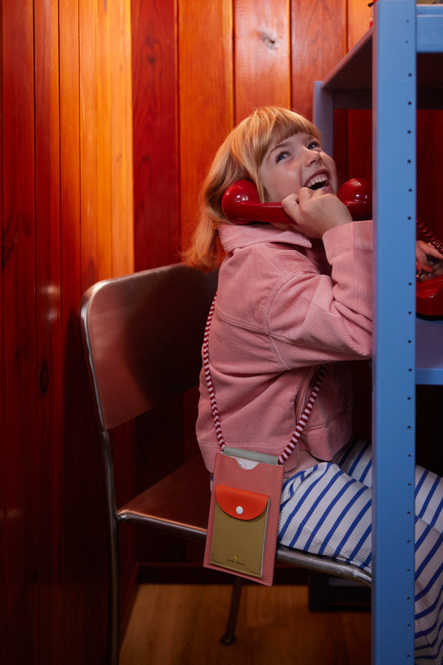 Keep your phone and small essentials close by, all while being fashionable at the same time. The phone pouch has space for three cards in the back and a small pocket on the front with that closes with a magnet button.