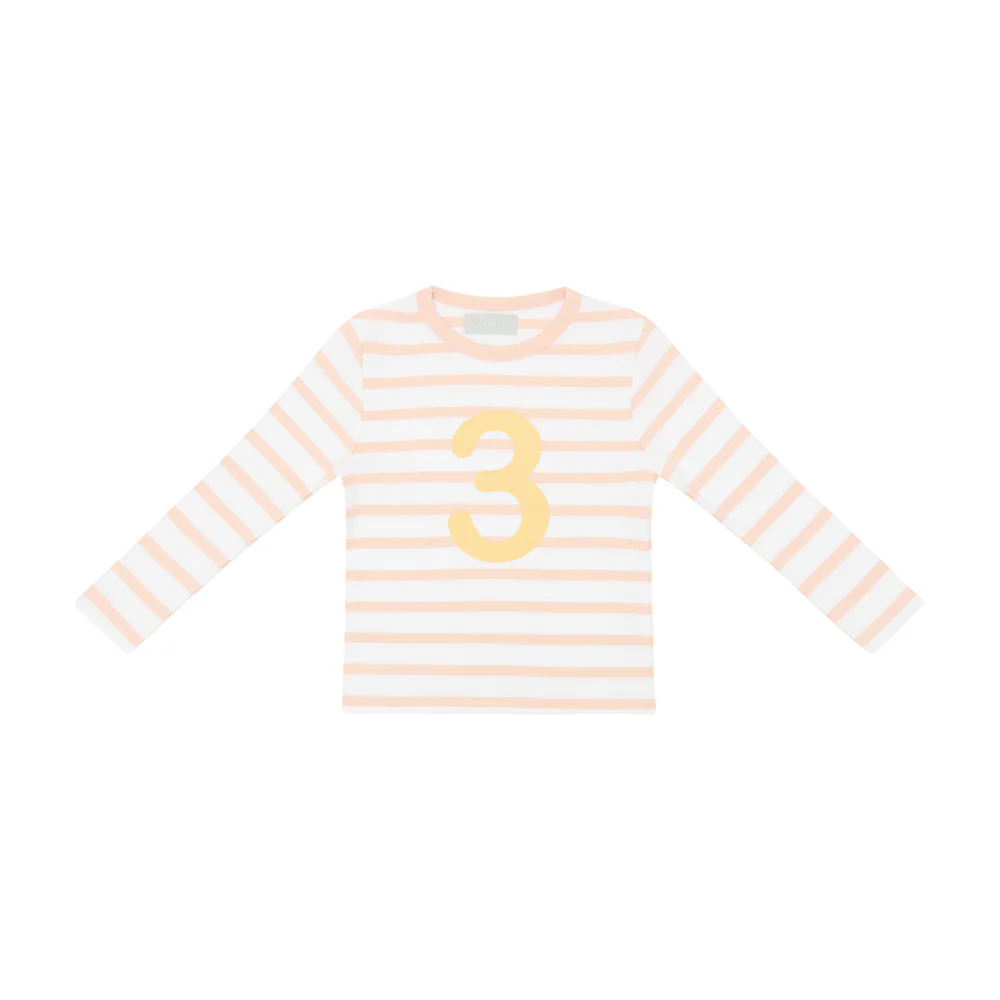 Powder pink & white breton striped cotton T shirt, featuring a lemon number 3 screen print. Long Sleeves only.