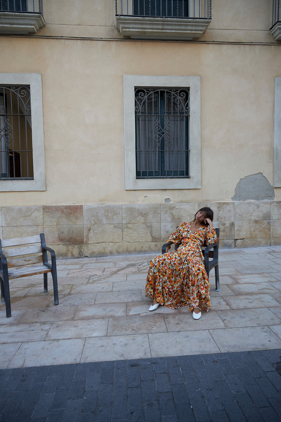 A light maxi wrap dress in 100% silk. It has 3/4 sleeves and a natural V-neck caused by the feminine wrap effect. The sleeves have a slight volume on the shoulders, and the waistband has a beautiful definition. The fabric is soft, luxurious, and 100% silk.