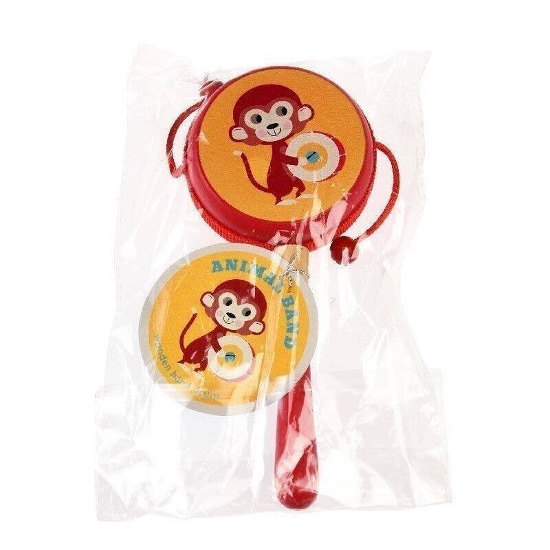 A toy rattle drum featuring the monkey playing a drum from our Animal Band design on each side of the drum head.