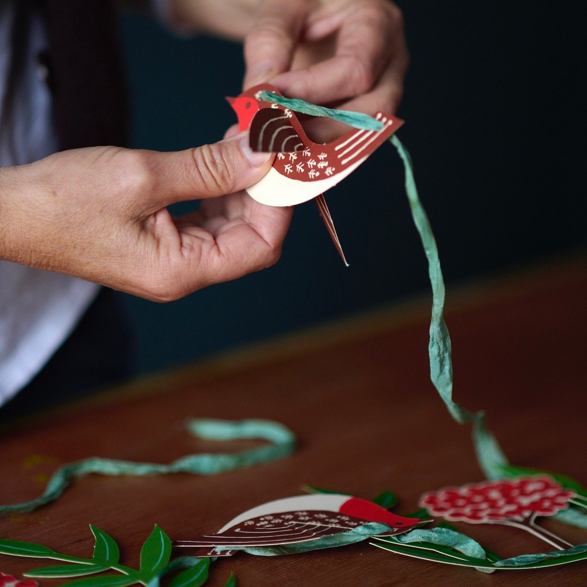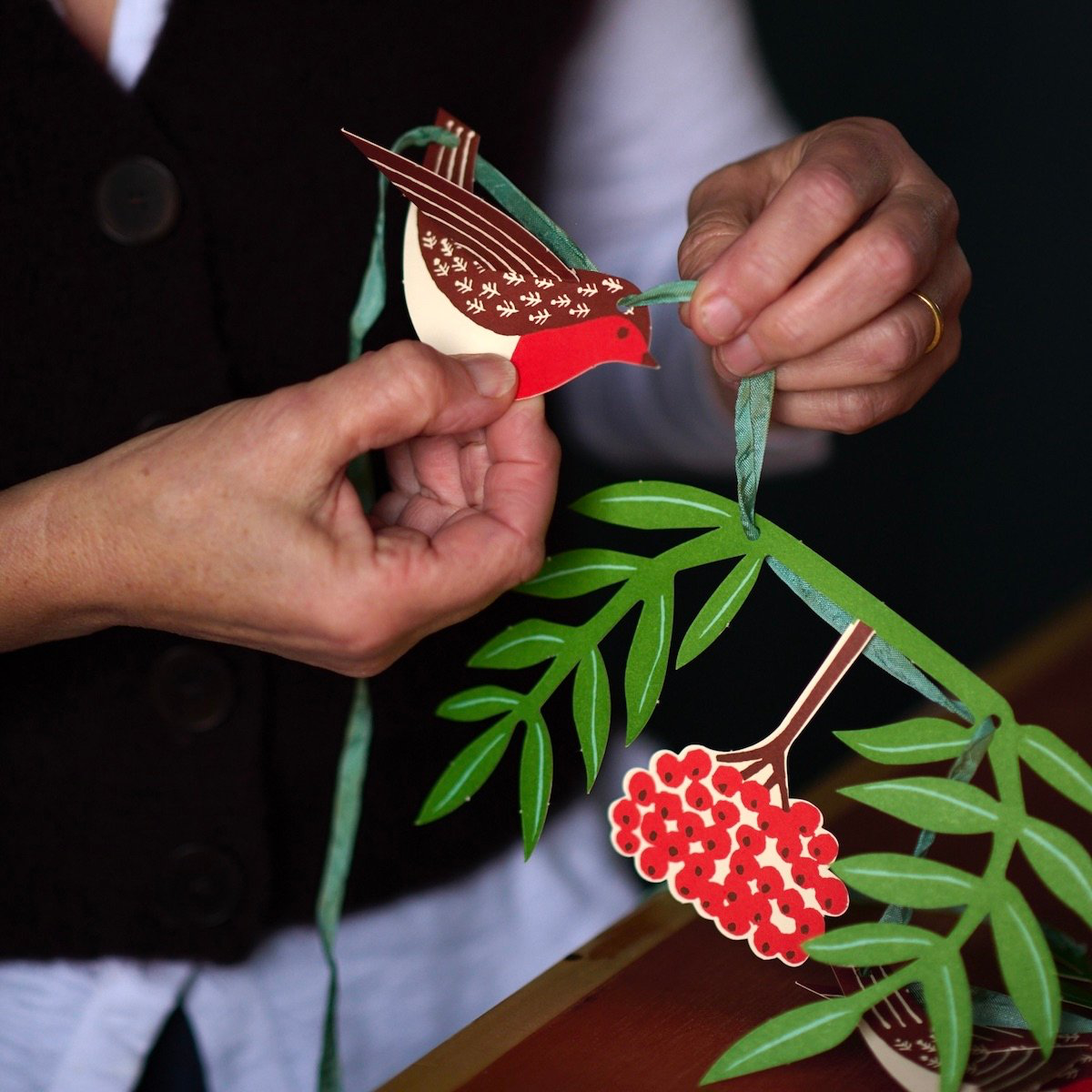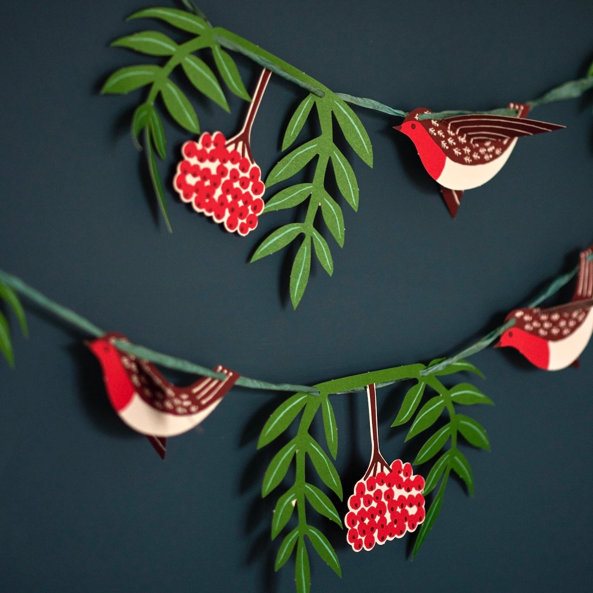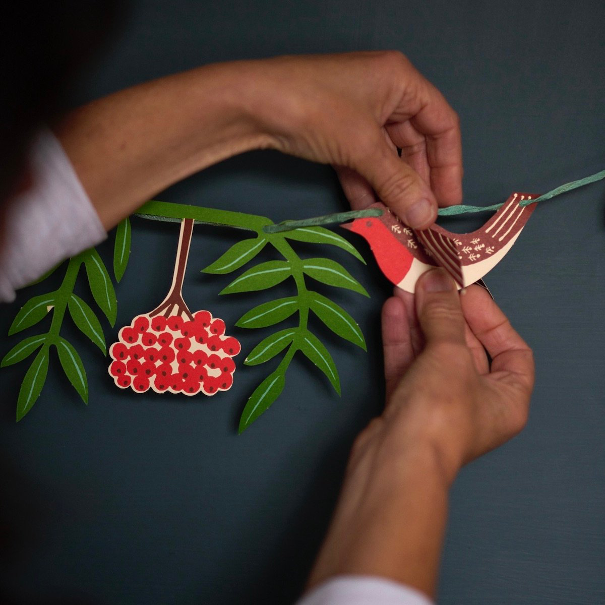 Six sprigs of rowan leaves and berries and eight very charming three-dimensional robins contained in a self-closing card wallet for long term storage. Pop out and string together on yarn or ribbon of your choice. The leaves and birds make approximately 2-3 metres of garland, depending on how closely they are strung together. Thread is not included. (The ribbon shown in the pictures is our Peacock vintage-style ribbon, available separately.)