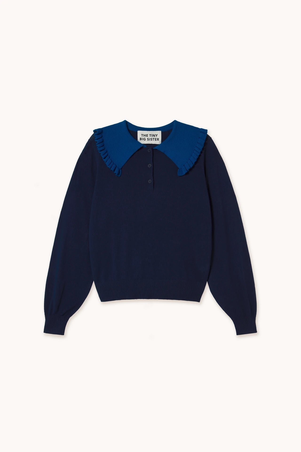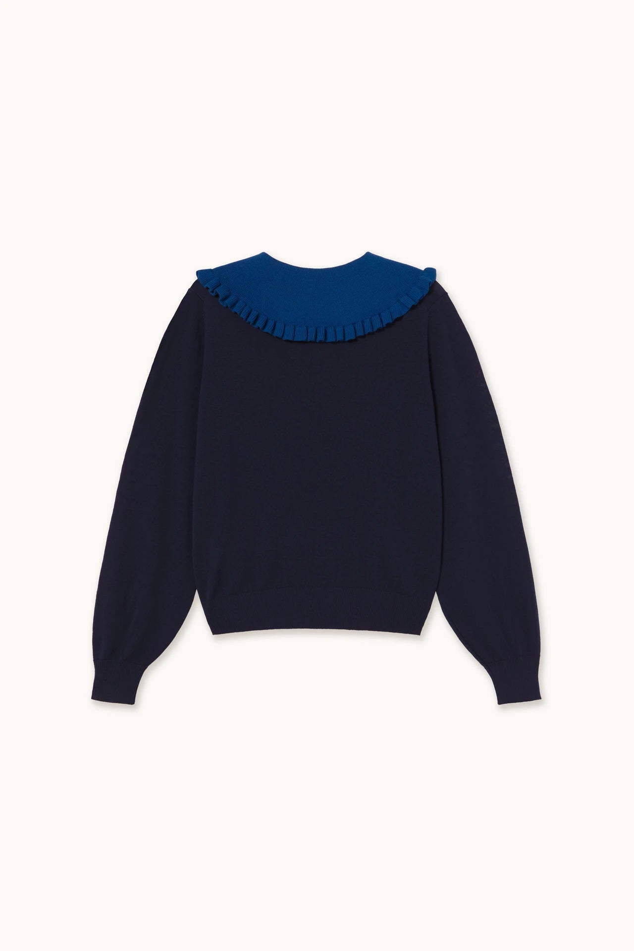 Crafted from extrafine merino wool in navy with a contrasting neck. Features a statement collar with subtle frill detailing for a sophisticated touch. Front button opening and ribbed hems complete the refined silhouette. Fully fashioned for a clean, structured fit.
