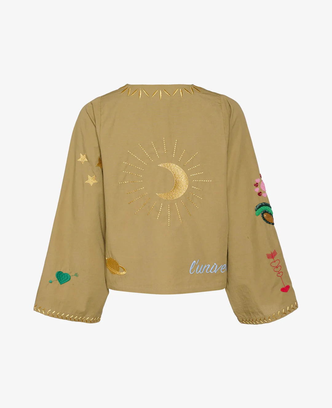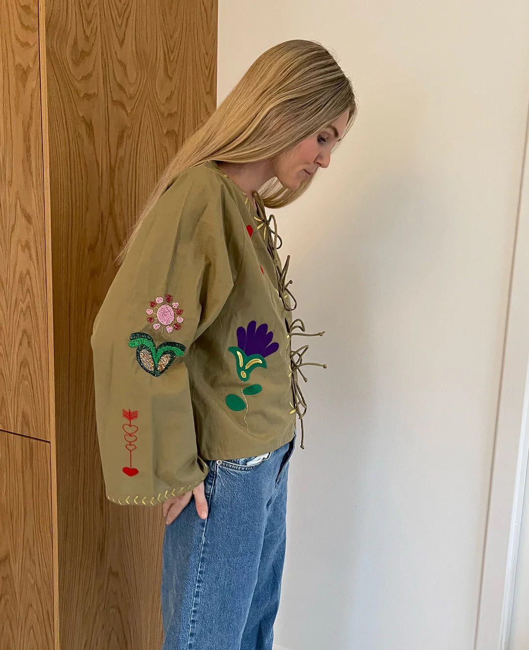 Sophie Top features a short top with long, flared sleeves and thin round strings to tie in placket front. The top is delicately decorated with different beautiful kinds of embroidery artwork. The different embroideries are made in either a sparkling lurex stitch, small beads embroidery and other different colorful embroidered symbols. The top is lined inside the body with 100% cotton lining with block print.