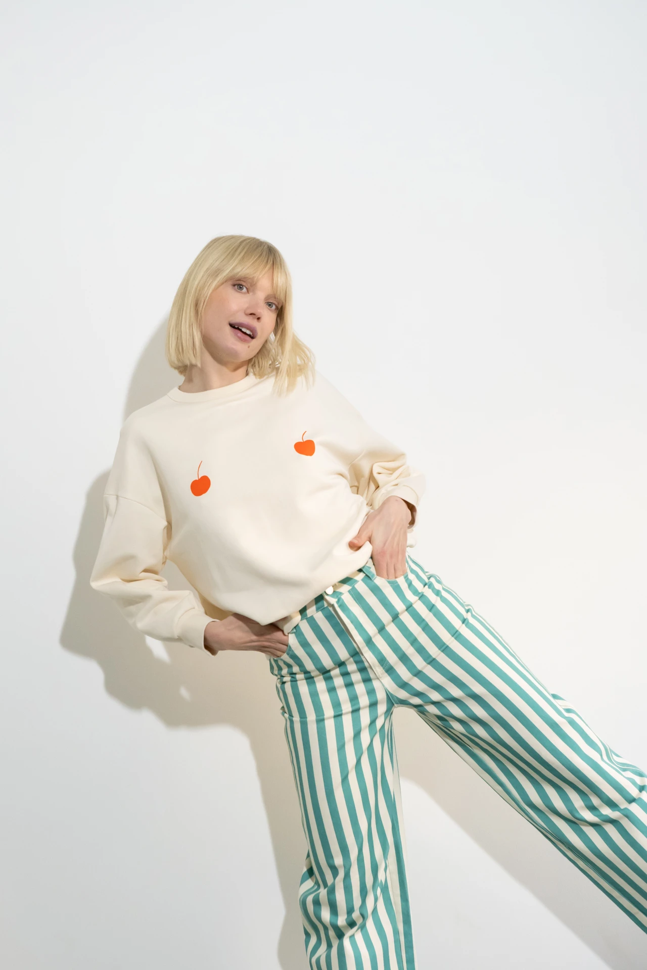 Our classic denim silhouette Berta. Hight waist with wide and elongated legs. Zip fly and 5 pockets design. Heavy cotton twill. Off-white base with printed stripe in emerald color.