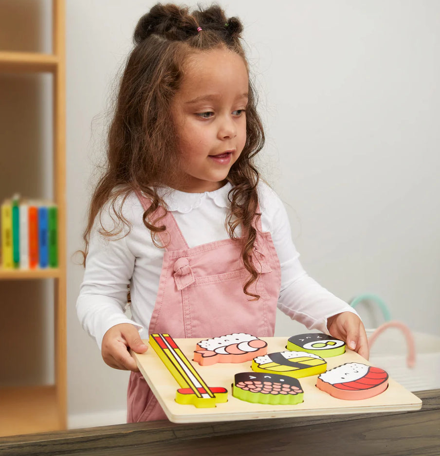 The Sushi Friends Wooden Tray Puzzle by Mudpuppy features bright and colorful artwork that introduce little ones to the world of sushi. With 6-8 chunky wooden pieces that slot into a sturdy plywood tray this wooden tray puzzle makes for a fantastic first puzzle or a great 1st birthday gift.