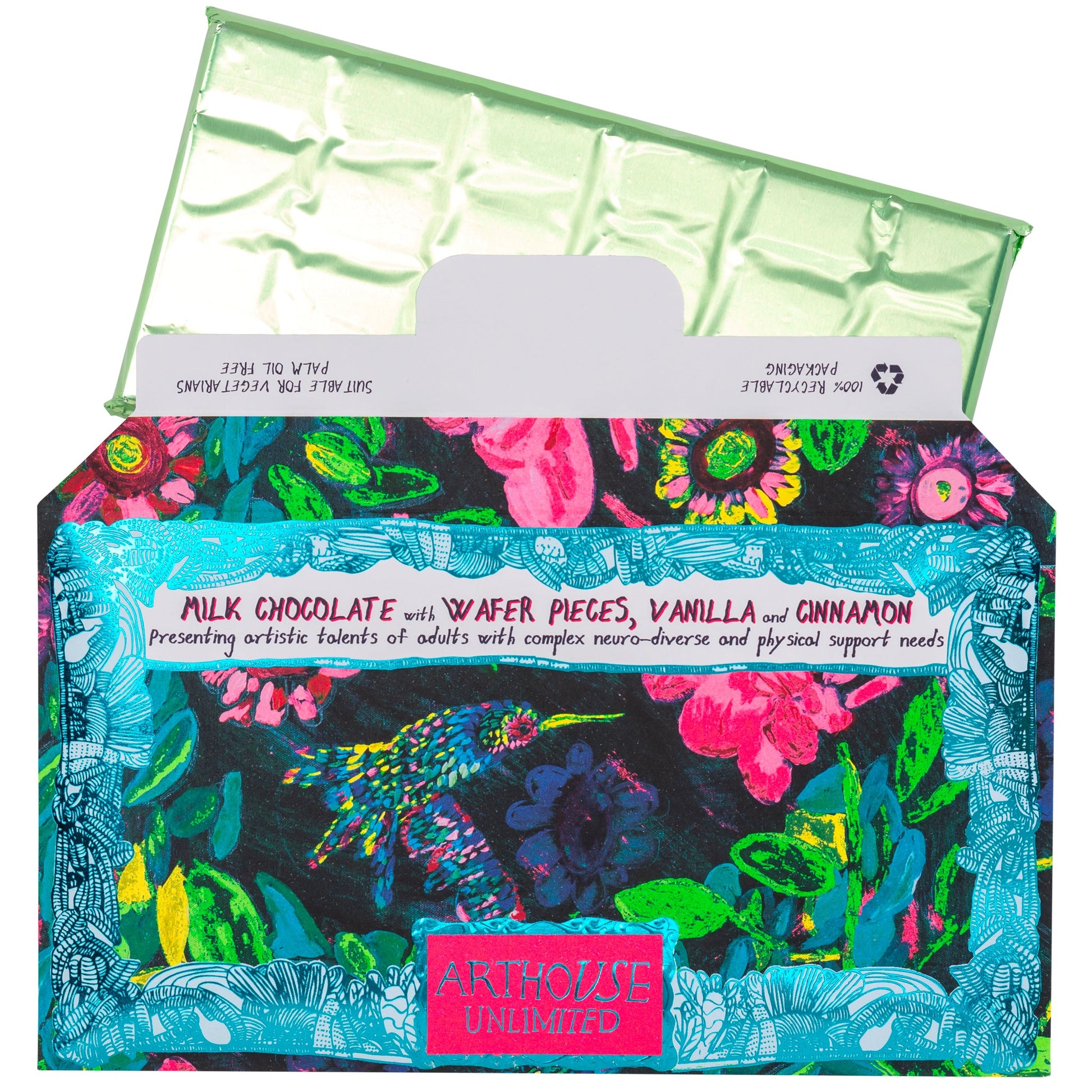 With wafer pieces, warm cinnamon spice & sweet vanilla notes this silky smooth milk chocolate bar is a sweet, nostalgic, ice-cream-sundae-like indulgence. Made in the UK with responsibly sourced cocoa, it features Elanor Sinden's original Sweet Nectar artwork presented in a dazzling turquoise frame. Wrapped in coloured foil & encased in a recyclable envelope, An ideal gift for chocoholics, art lovers & good-cause supporters everywhere!