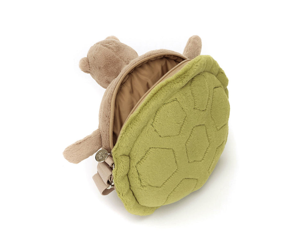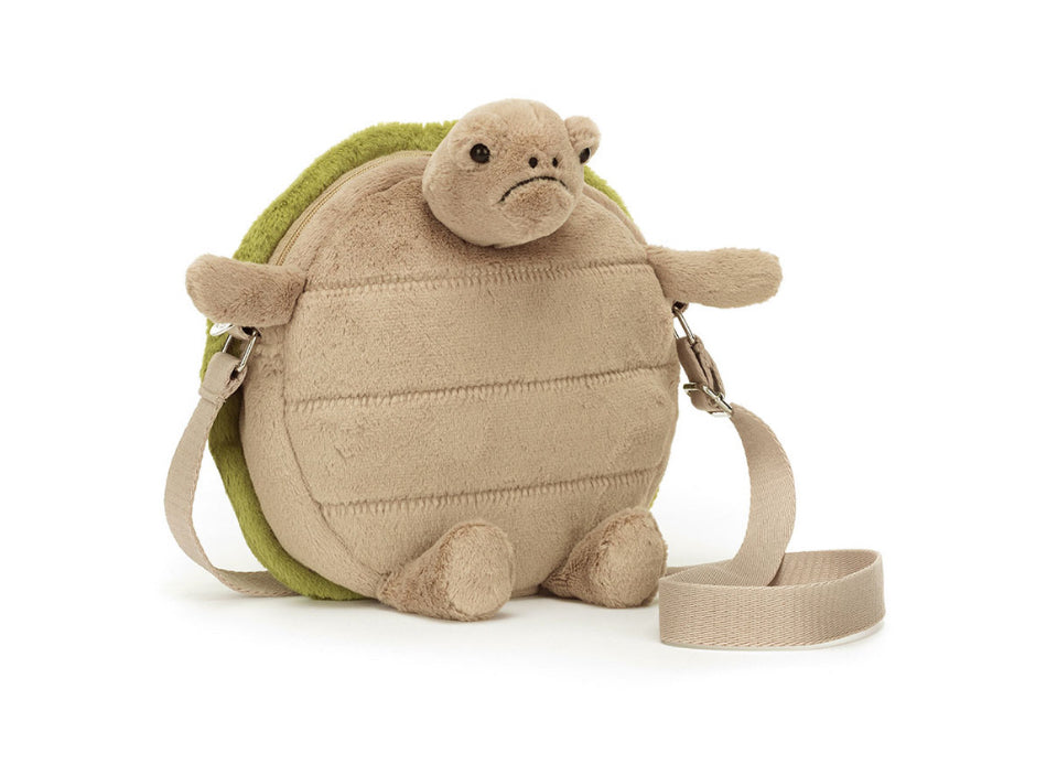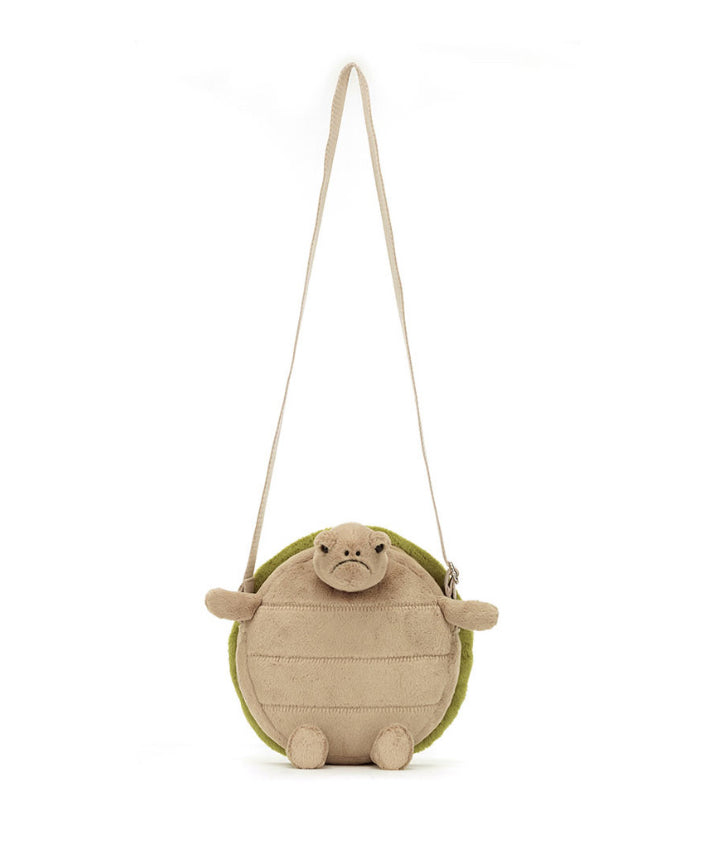 The Timmy Turtle Bag is charmingly grumpy, with a textured beige tum and embroidered green shell. The strong webbed strap will keep Timmy safe riding on a shoulder. With a silver zipper, Jellycat tag and protective beige satin lining, this bag holds everything but grudges!