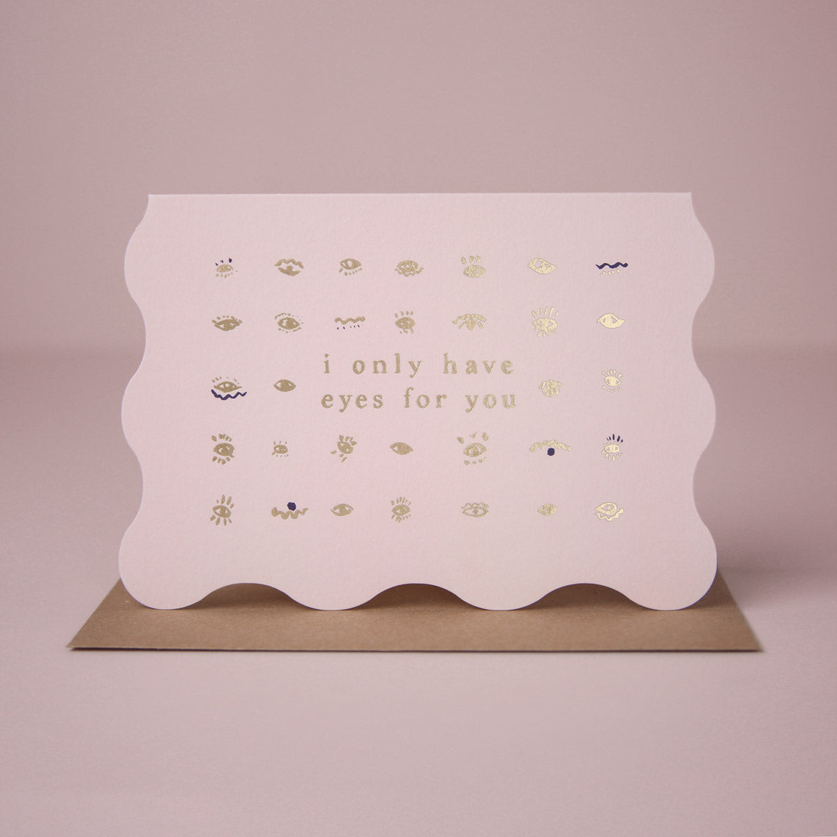 On a background of hand-painted eyes, the gold foil caption on this love card reads 'I only have eyes for you'. Perfect alternative anniversary card, love card or just because.