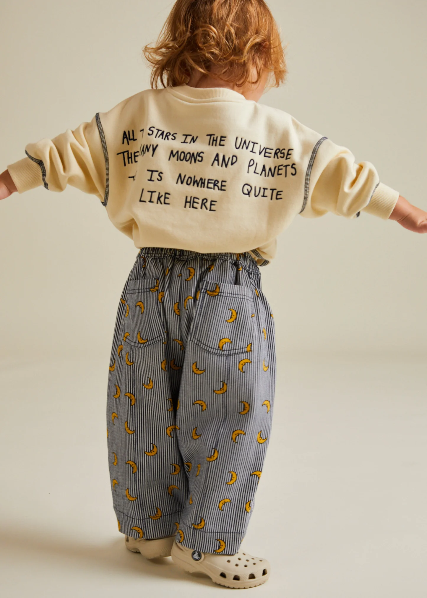 With it's oversized fit, soft neutral tone, and peachy brushed finish, it’s perfect for everyday wear. Featuring a small moon graphic on the front and a large embroidered universe story on the back, this piece brings storytelling to life - available in baby and children’s sizes for the perfect matching looks.